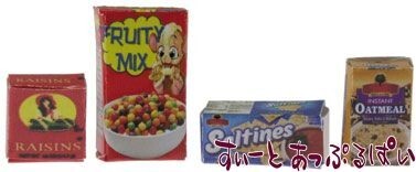 フードパッケージのミニチュアです。こういうのは、どれだけあっても良いですよね?柄もかわいいです。紙製ですので、少々潰れたり、接着がはがれたりしております。それくらい自分で直すからいいわ!という方にはぜひお勧めです。キッチンやパントリーのアクセントにぜひ!一番大きな箱のサイズ:15x25x5mm、レーズンボックスのサイズ:15x15x5mm