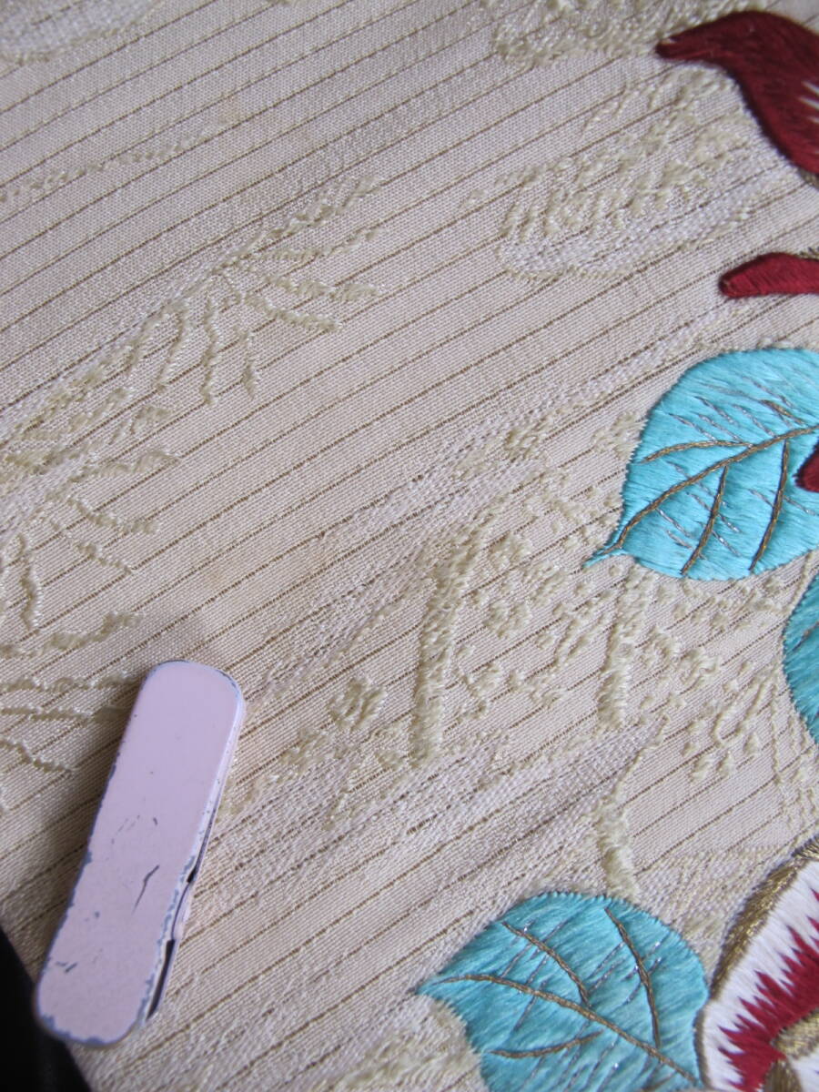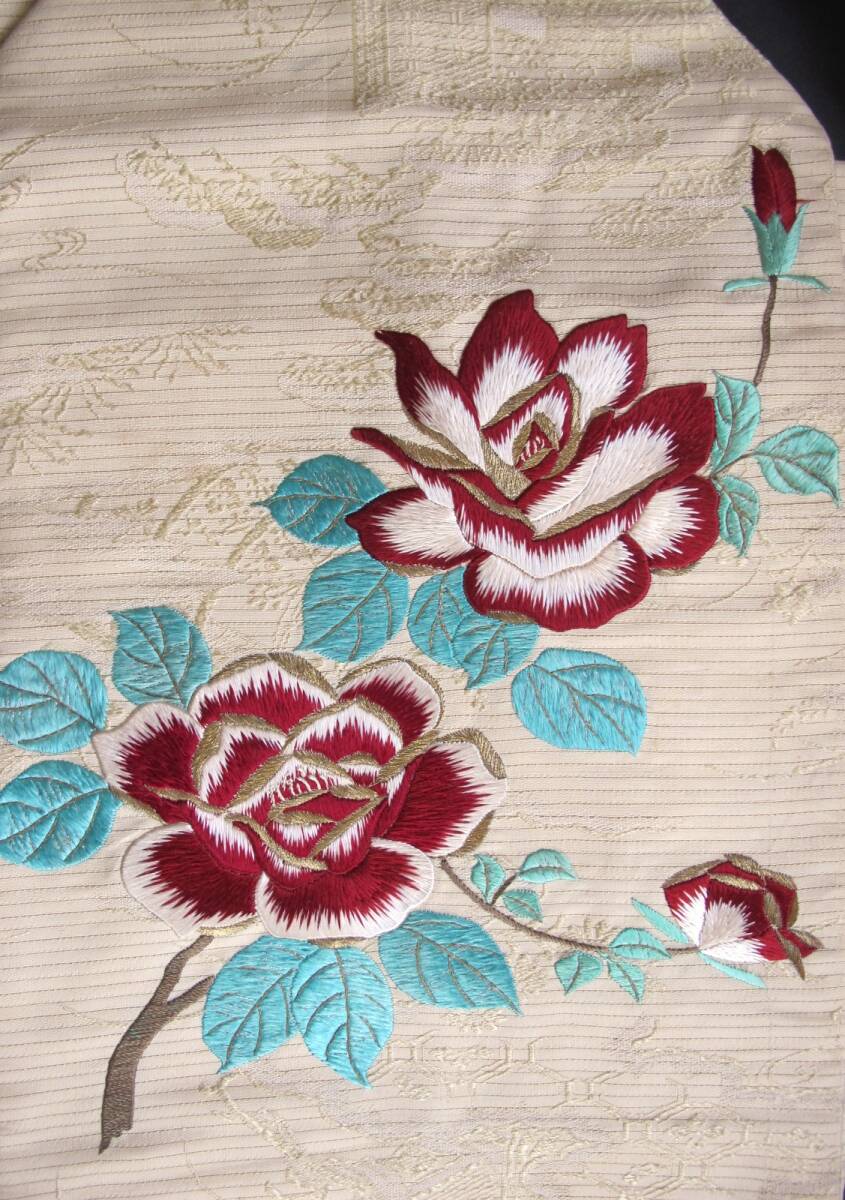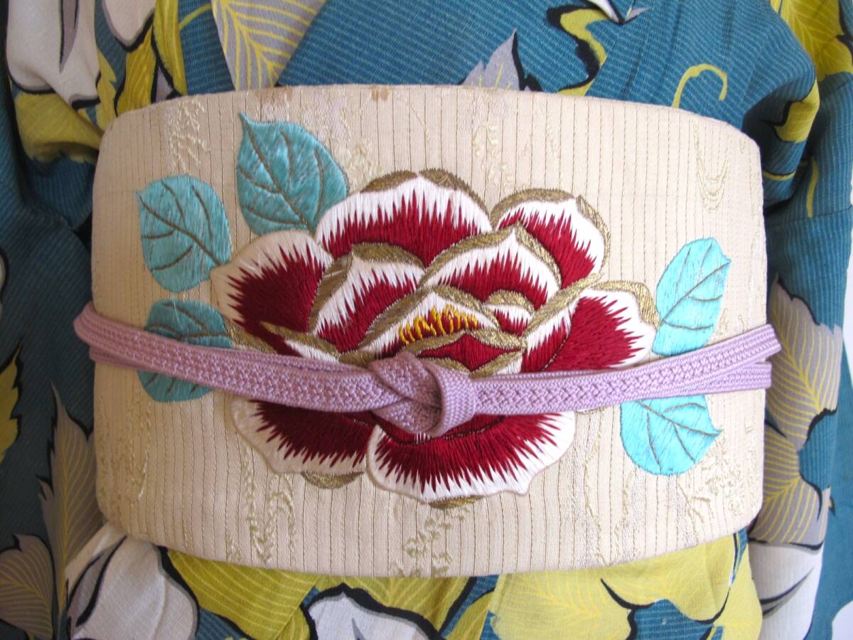 赤い薔薇のアンティーク絽名古屋帯です。 地紋の入ったクリームベージュの地が大人っぽく上品です。 |