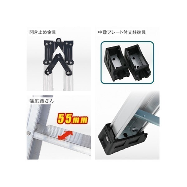 ![]() ●高所作業に適した専用脚立 ●安全の基本機能を集約し耐久性と安全性をアップ ●両面ワイドステップ55mm幅広踏ざんを採用 ●ワンタッチ式開き止め金具を採用 ●中敷プレートを追加し脚端具の強化を実現 【商品詳細】 設置サイズ:幅63.1cmX奥行121.7cm 本体重量:7.2kg 段数(天板除く):5段 収納時サイズ:幅63.1cmX奥行16.9cmX高さ181.6cm 耐荷重:100kg 天板高さ(全長):1.7m 使用最大高さ:1.4m はしごの長さ:3.6m はしごの接点:2.98m~3.18m 使用角度:75度 材質:アルミ合金 メーカー:アルインコ株式会社 型番:PRS-180WA 原産国:中国 |