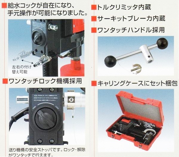 | ウレタンホース付給水コックを採用し、方向性の自由度を高め、ビット回転部から離れた位置での給水操作が可能です。また、クランプカバー左右に配置したフックに固定もできます。 | ||