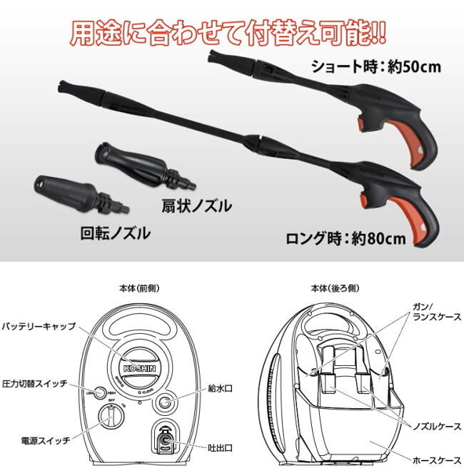 | ・ SJC-3625 の長時間タイプ SJS-3625の約倍の運転時間 ・ コードレスなので、どこでも使える バッテリーなので給水タンクさえ用意すれば電源のない場所でも使用できます。(ただし自吸30cm以内) 自転車、バイク、農機具、船、お墓など様々な場所で使用可能です。 お家まわりでのご使用時には、水道直結で使えます。 (※給水タンクは別売り) ・女性が持ち易い&運び易い 本体形状は腰に負担がかからない縦型を採用。 日本女性が持ち易いグリップ形状。 ・高圧・低圧の切り替え可能 スイッチ一つで高圧・低圧の切り替え可能。 低圧では網戸やエアコン室外機のフィンなどデリケート部分の洗浄にも使用できます。 ・使い方カンタン! 工具なしで簡単に組み立てができます。 (1)バッテリーを付ける (2)水道につなげる (3)本体につなげる ・ノズルガンの長さが長短変更可能 延長ランスの脱着ができるので、洗浄の用途が広がります。 ・すっきり収納 ホース、ガン、ランスなどに全てのパーツを本体内に収納できます。 しかも、市販のほどんどのベランダストッカーに収納可能です。 ・給水タンク付き 水道の無い場所でも気軽に洗浄(タンク容量:約20L) |