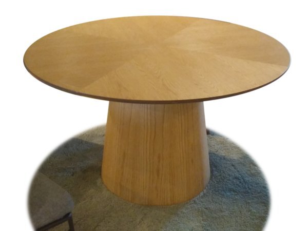 オーク突板を矢貼りにデザインした円形のダイニングテーブル。脚にはあえて重さをだした円錐形のデザイン性の高いものにし、安定感があります。シンプルなデザインなので、お気に入りのチェアをセットしてご使用下さい。