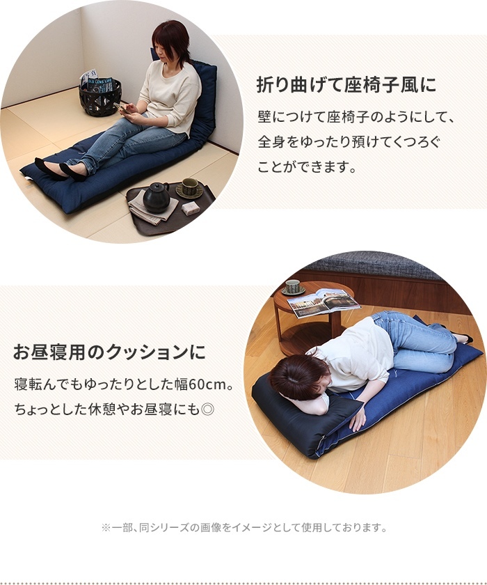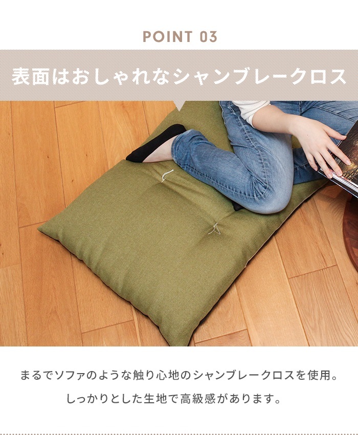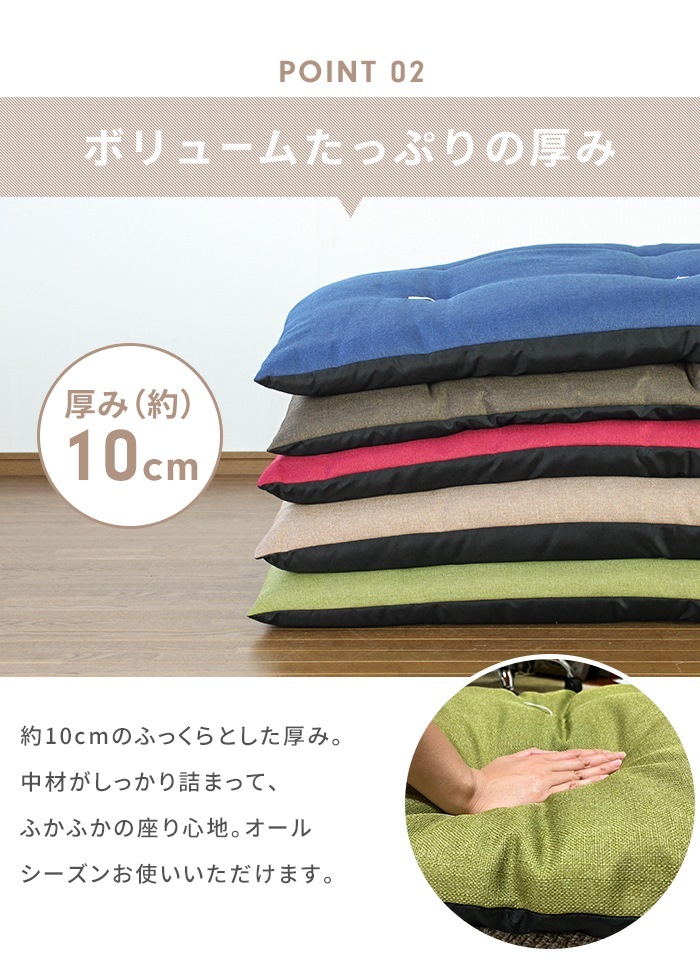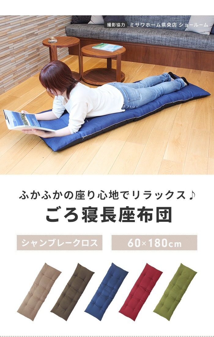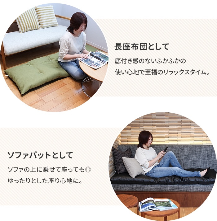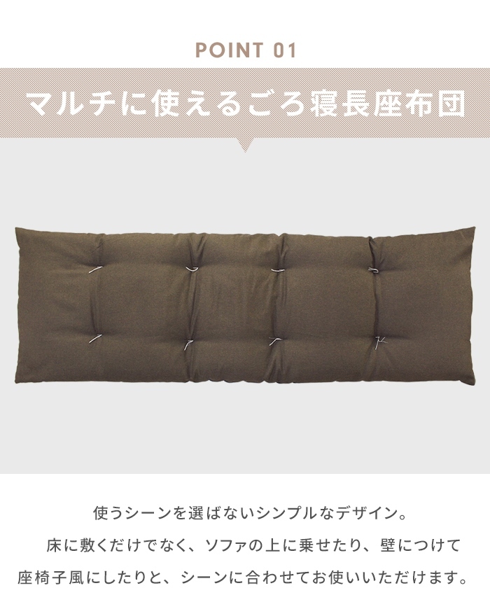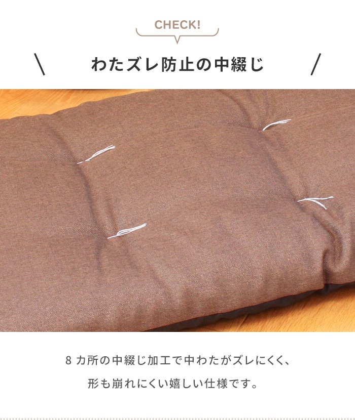 | 通常の座布団の3倍以上、長さ180cmで一人はもちろん、二人でもゆったり座れるロングサイズの長座布団。 たっぷり中綿を入れることで、ふっくらとした座り心地に仕上げ、わたのヨレ・ズレ防止のための和止めが6か所施してあります。 座ったり、ごろ寝したり、赤ちゃんのお昼寝マット、壁にあてて座椅子代わりに、ペットのお座敷座布団としても◎ シンプルな無地のカラーが和室だけでなく洋室にもぴったり。 (いずれのカラーも底面は黒のナイロン系生地となっております。) |