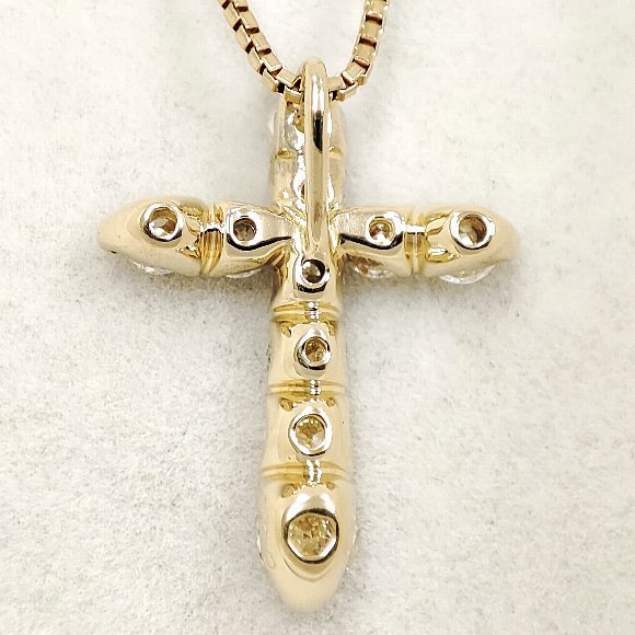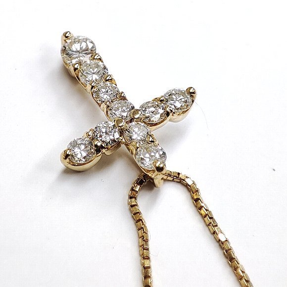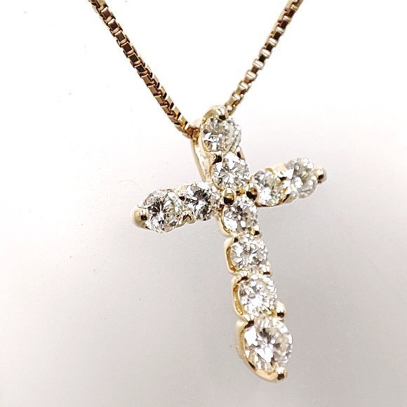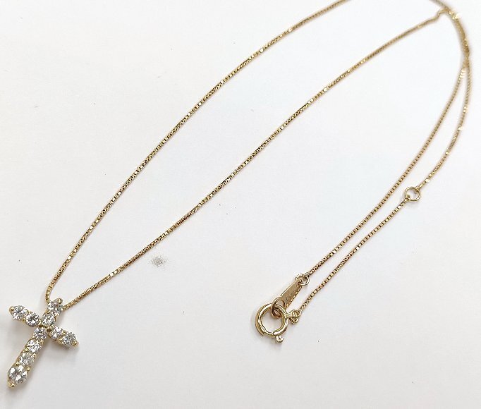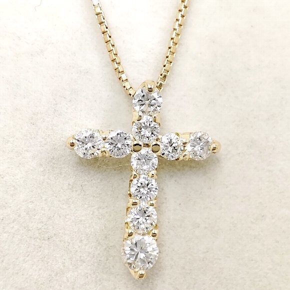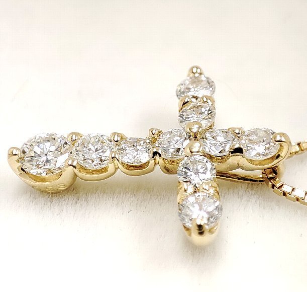 合計 10ピース 0.53カラットの天然ダイヤモンドをクロスのデザイン上に石留めしたペンダントトップです。チェーンの全長は、約40.5センチでベネチアンチェーンが使われており使用感によるチェーンのヨレが確認でします。ダイヤモンドのクラリティは主観になりますが、 Iクラスに揃えられております。輝きは強く綺麗です。 |