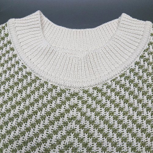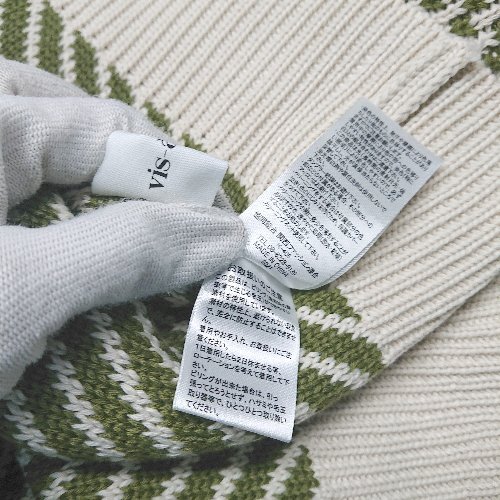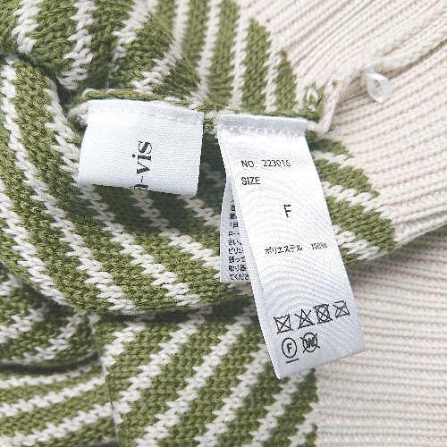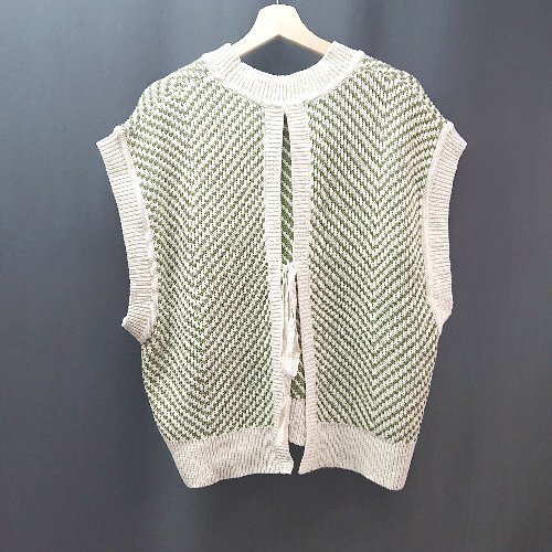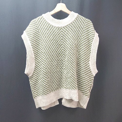 ◇ vis-?-vis ビザビ モックネック 総柄 ケーブル リボン ノースリーブ ニット サイズF グリーン ベージュ レディース E