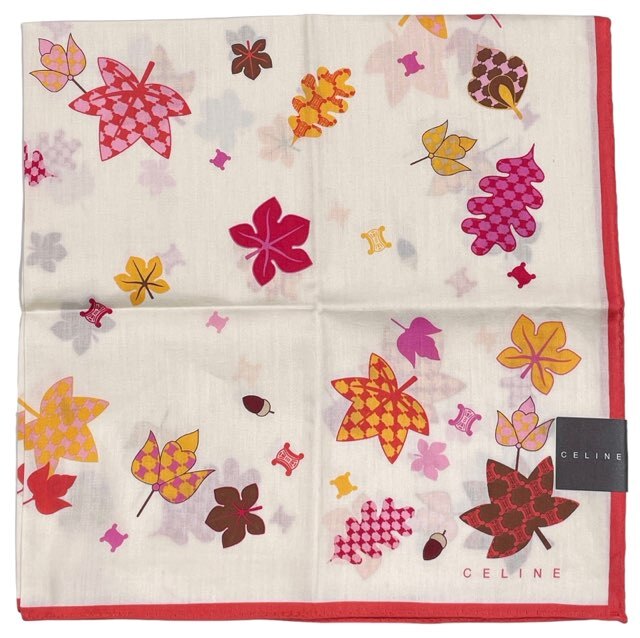 未使用 セリーヌ ハンカチ マカダム ロゴ もみじ レッド CELINE 紅葉 スカーフ コットン 100% レディース 【中古】