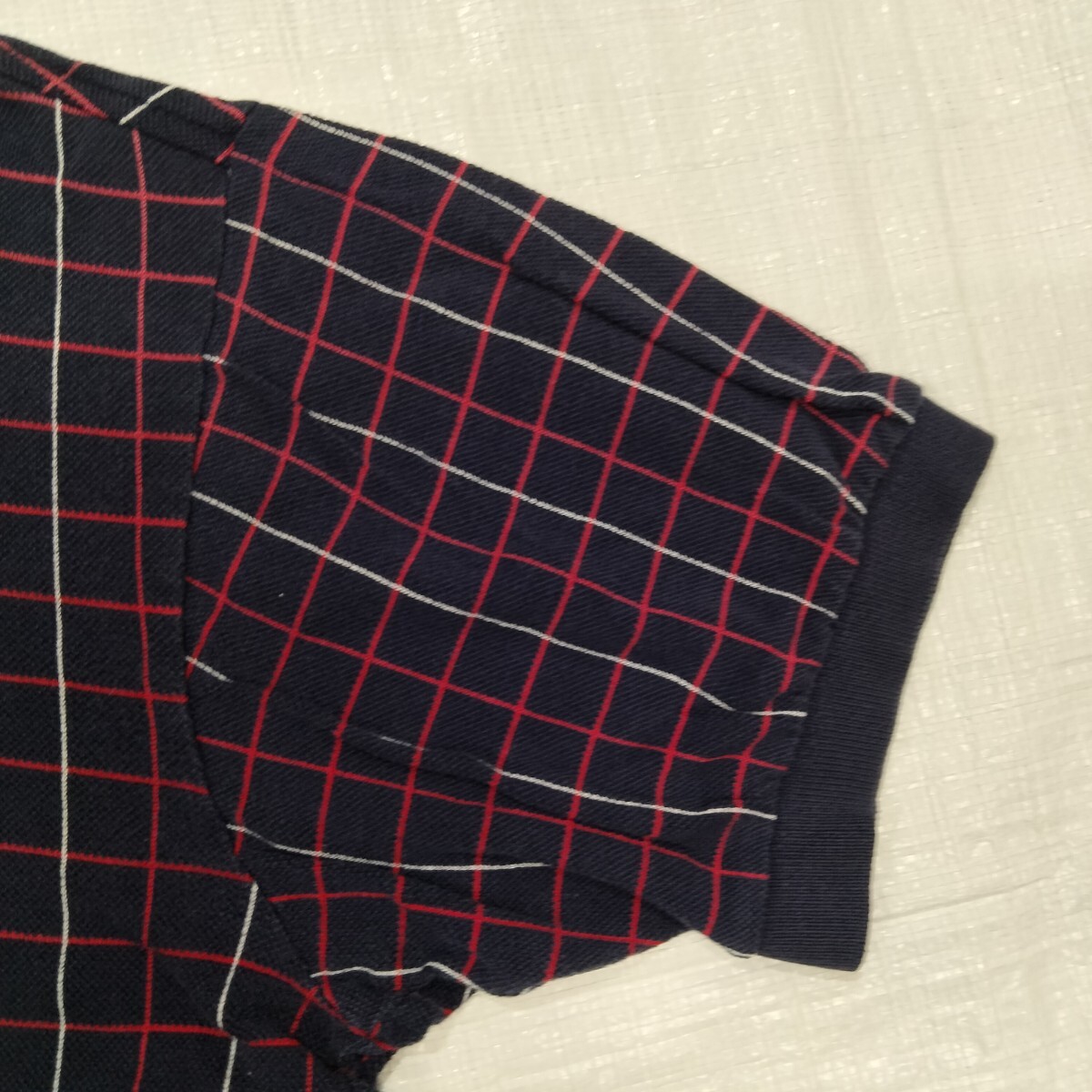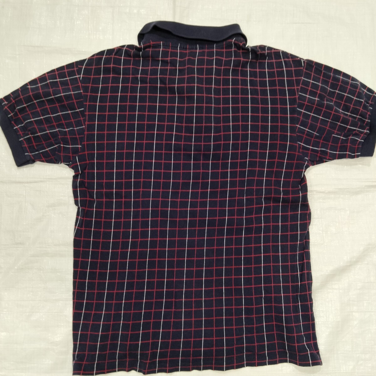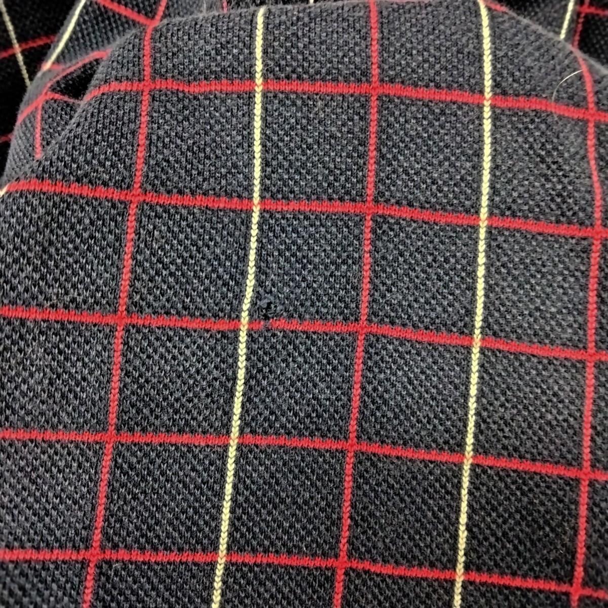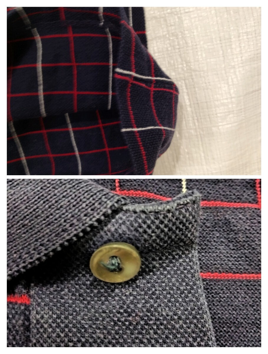 コットン100% ネイビーにred white 糸の ウィンドウペン チェック。チャコールグレー ボタン。柄もののため L1212と違い裾スリット無し。襟タグは横長 下側にサイズタグの2枚タグ。