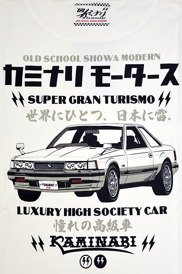 「JAPANESE BAD BOY」をコンセプトに掲げ、昭和の由緒正しき不良文化にロックなスパイスを注入したブランド「カミナリ」より「デートカー長袖Tシャツ(KMLT-230)」が入荷してまいりました。 昭和のバブル期を彷彿させる、初代ソアラをオマージュした長袖Tシャツが新登場! 白いソアラは若者を中心にハイソなデートカーとしても絶大なる人気を得て、デジタルメーターの採用などの先進装備でラグジュアリークーペの地位を確立しました。 2ドアクーペながら余裕のある居住性を確保するボディ形状も初代ソアラの魅力で、他のクーペタイプとは一線を画す、大変なプレミアが付いている名車がモチーフです。 モノトーンなカラーリングでシックな仕上がりが魅力的。 袖には「カミナリモータース」のロゴ入りのラインをそれぞれプリントしました。 生地には、カミナリお馴染のよれにくくタフなボディーを採用しています。 | |||||||||||||||||||||||||