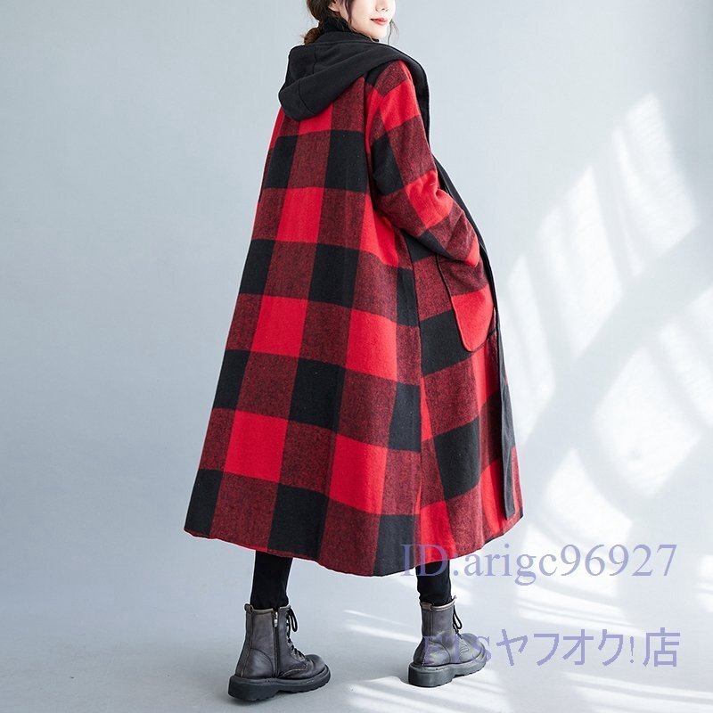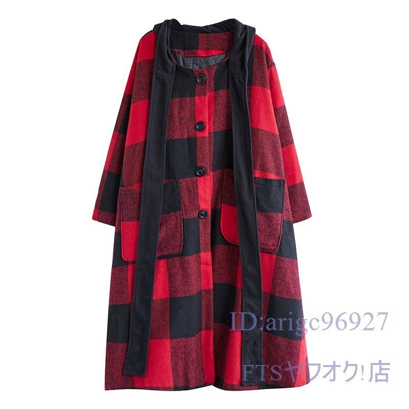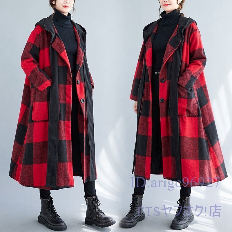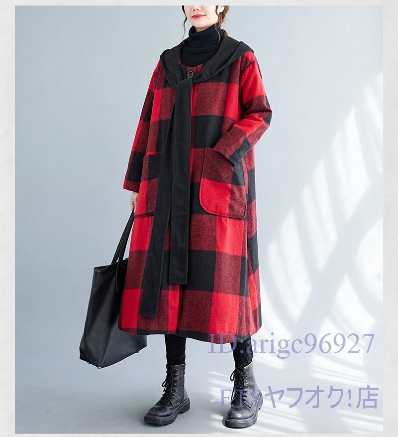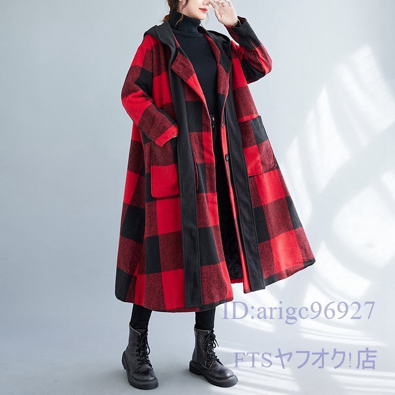 V793☆新品XLサイズ■レディースラシャコート 上質 防寒 フード付き ロングコート 秋冬 アウター チェック柄 大きいサイズ