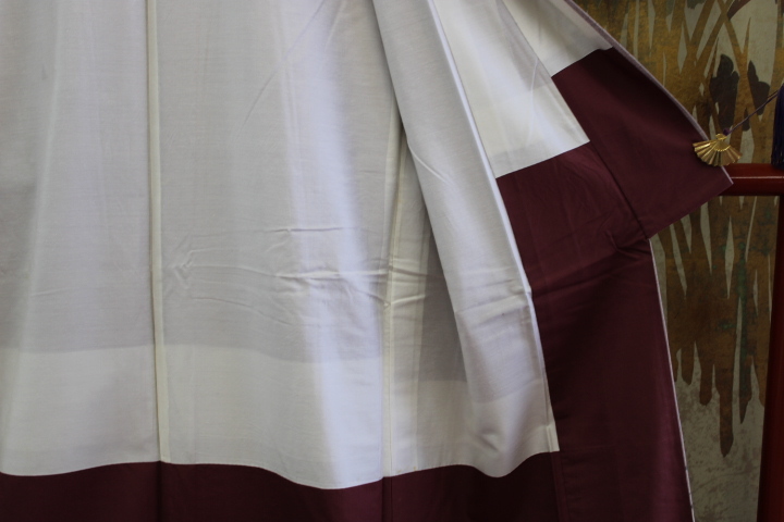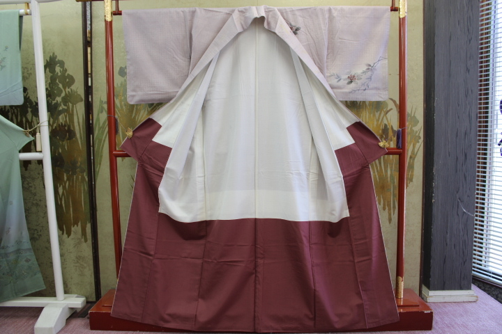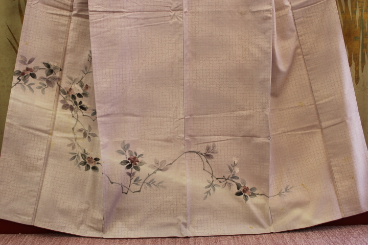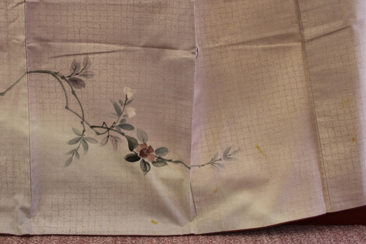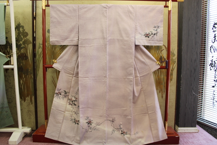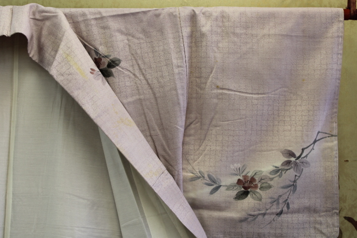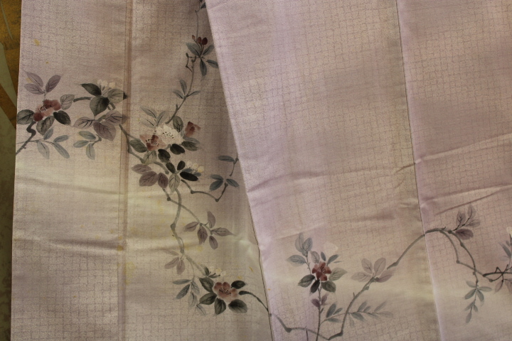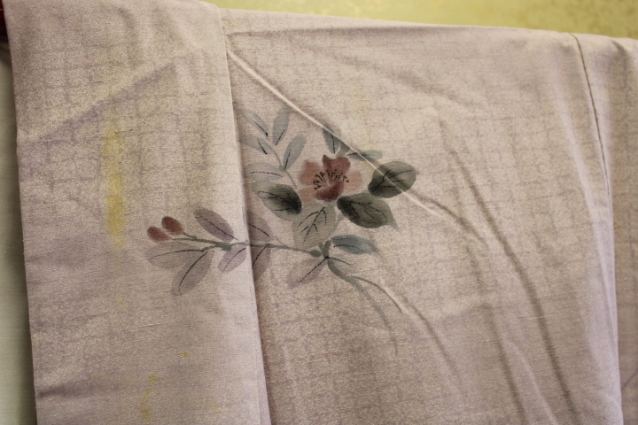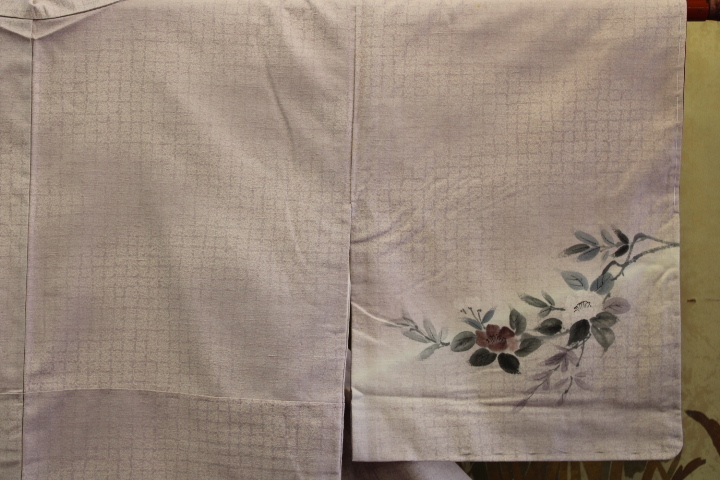 付け下げ訪問着 袷手縫い仕立て 正絹駒上代地 淡い藤色にサザンカの花を素描で表現してます