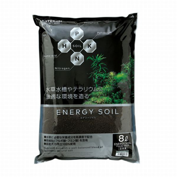 ※重量がありますので同梱数は3つまでとさせて頂きます。商品説明水草育成に特化した!!「高濃度栄養含有ソイル」です。エナジーソイルは良質な国産天然黒土を原料に水草の成長に必要な窒素・カリウム成分やその他微量元素などを絶妙にブレンドした栄養系ソイルです。保肥性にも非常に優れるため、長期間にわたり水草の根が栄養分を効率良く吸収します。又、比重が大き目のソイルの為、水草の植え込みが容易に行なえます。●pHを弱酸性に保つ事ができ、pH6.0~6.5で安定。●ソイルの粒が崩れにくい為、根腐れが起きにくい。●弱酸性の軟水水域の淡水魚やエビなどの飼育にも最適。●殺菌処理済みなので安心。●通水性、保肥性が非常に優れ、水草の根張りを良くする。●粒の比重が比較的大きいので水草が植えやすい。●従来のソイルより栄養分が長期間持続。●テラリウム用の底床としても使用が可能。