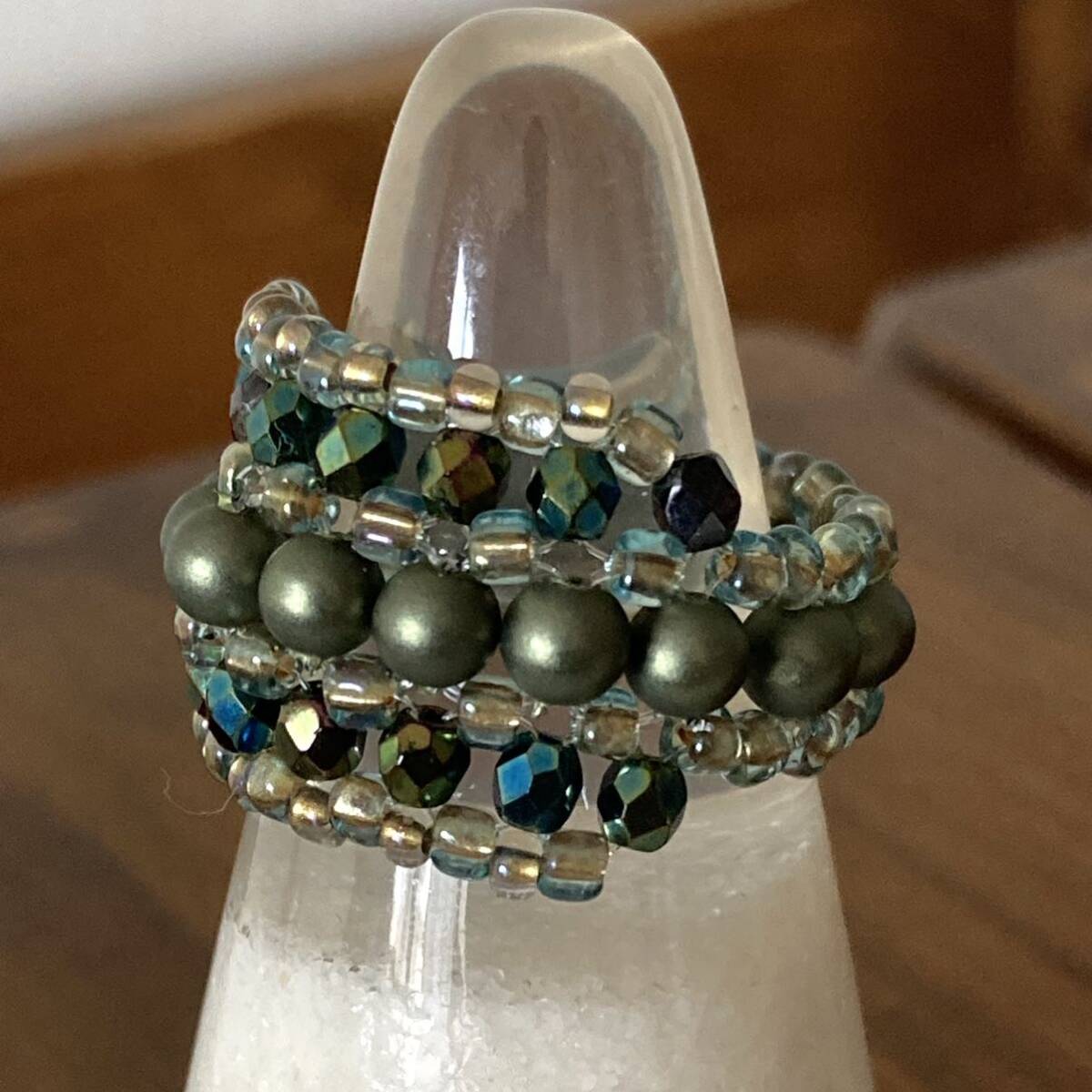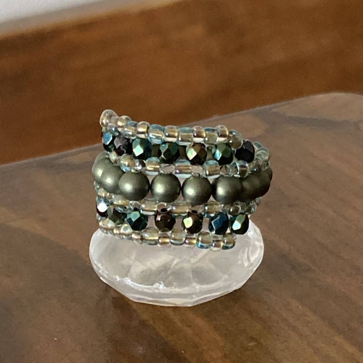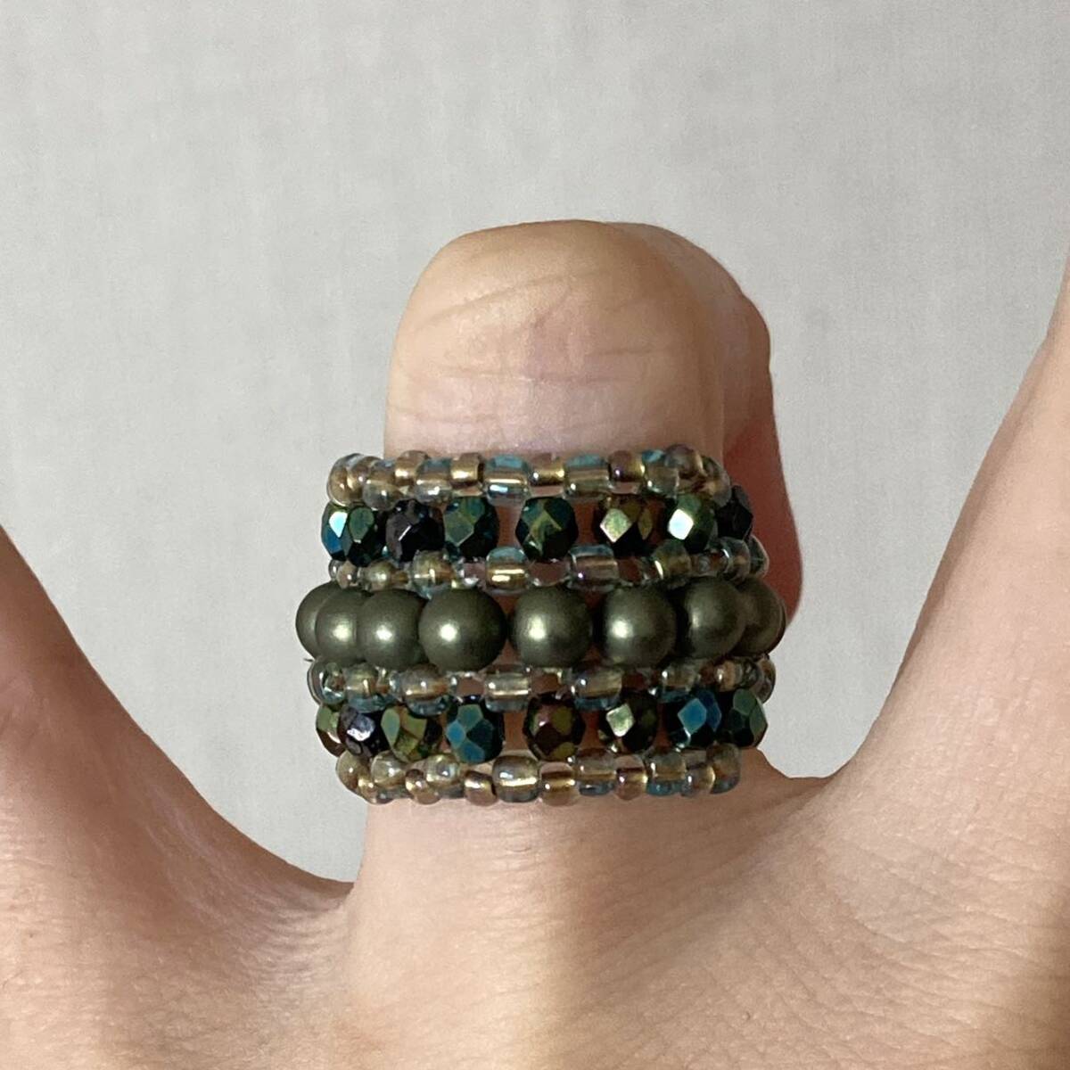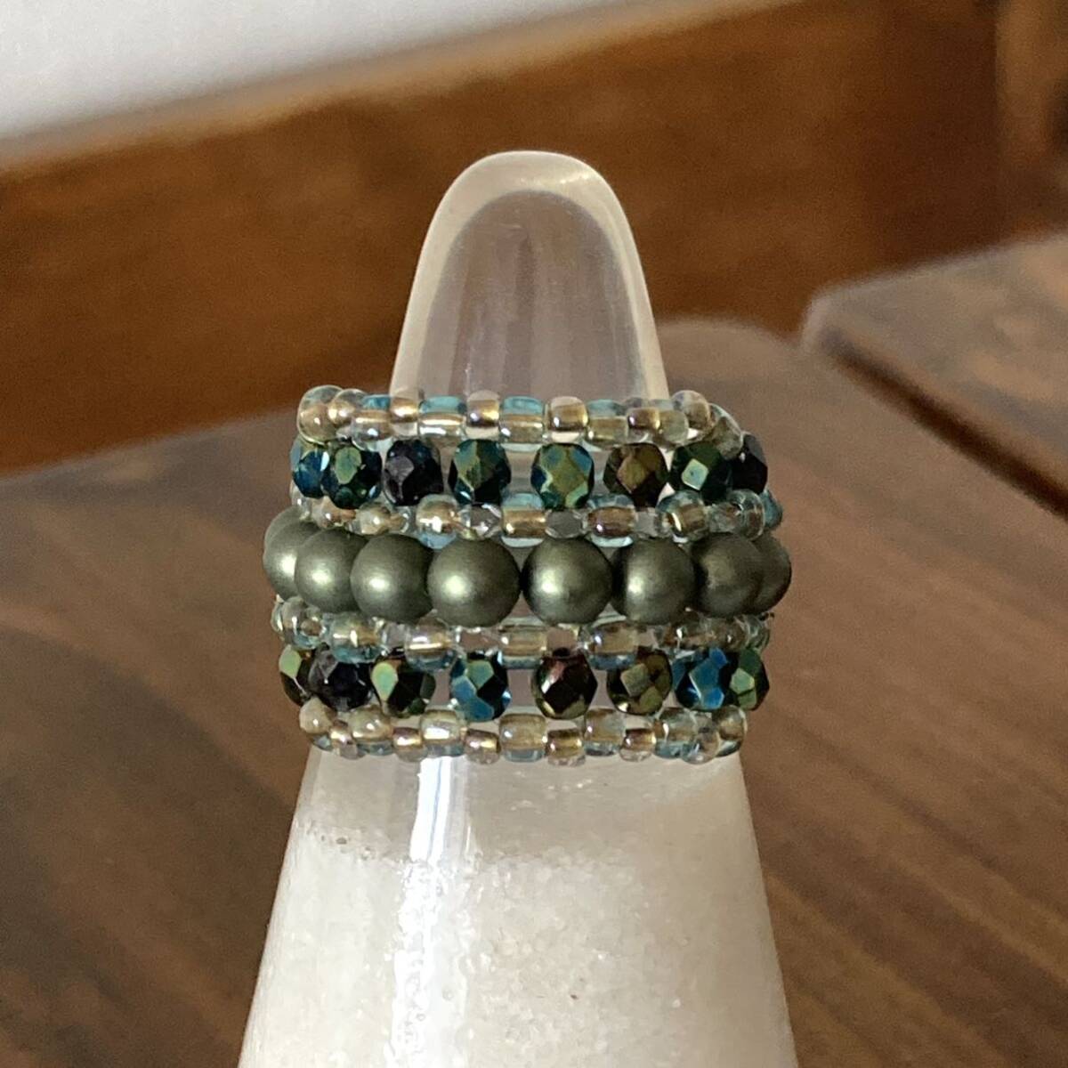 4mmグリーンのパールビーズ、3mmのグリーンメタリックのチェコビーズ、ライトグリーンのトライアングルビーズ、クリアゴールド系の丸小ビーズで作ったリングです。