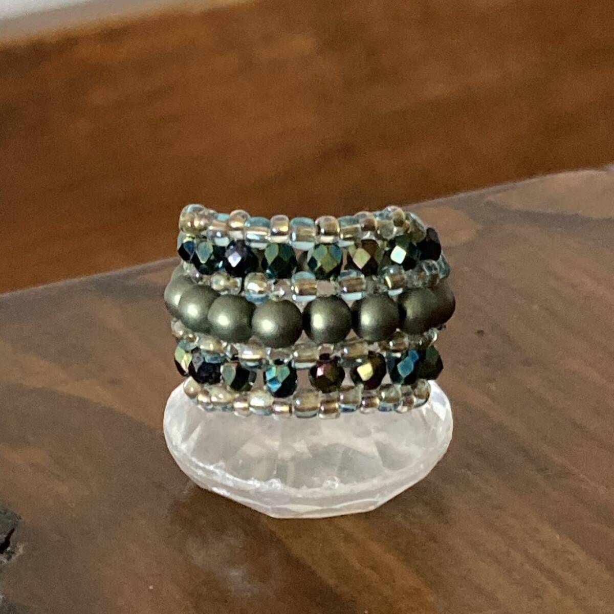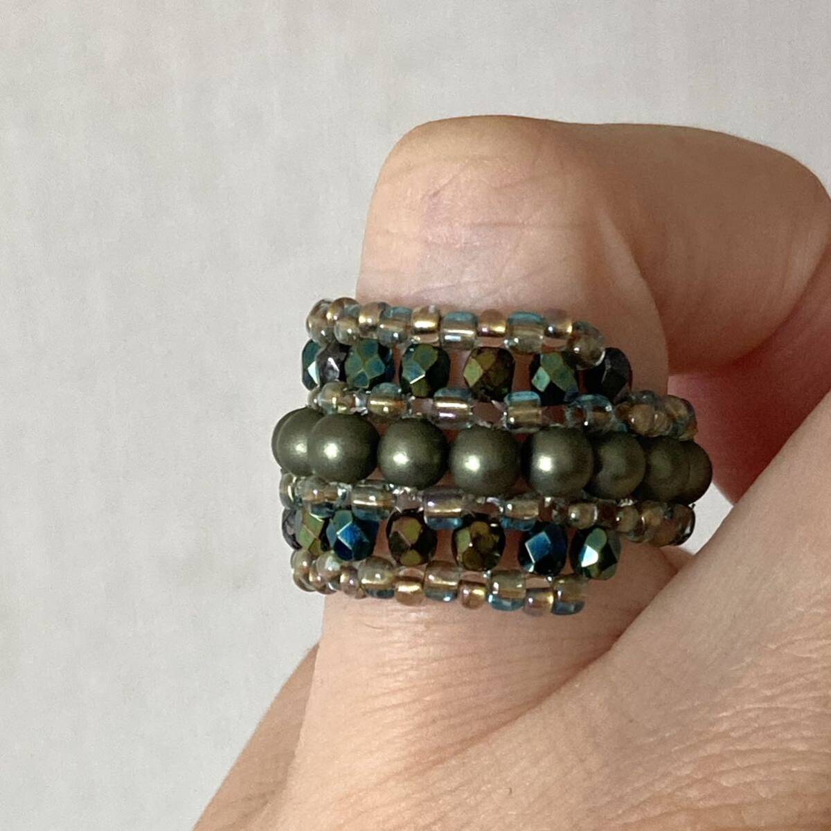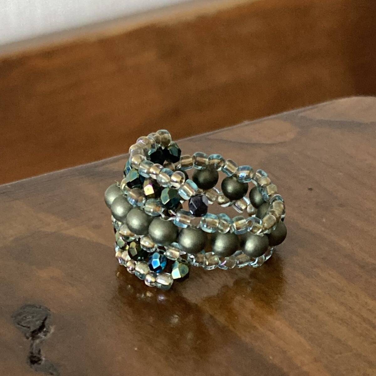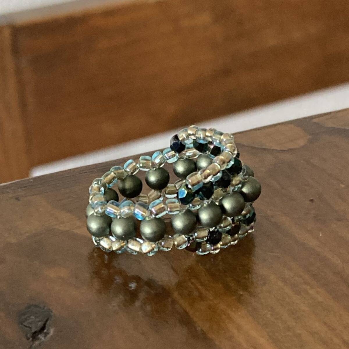 4mmグリーンのパールビーズ、3mmのグリーンメタリックのチェコビーズ、ライトグリーンのトライアングルビーズ、クリアゴールド系の丸小ビーズで作ったリングです。