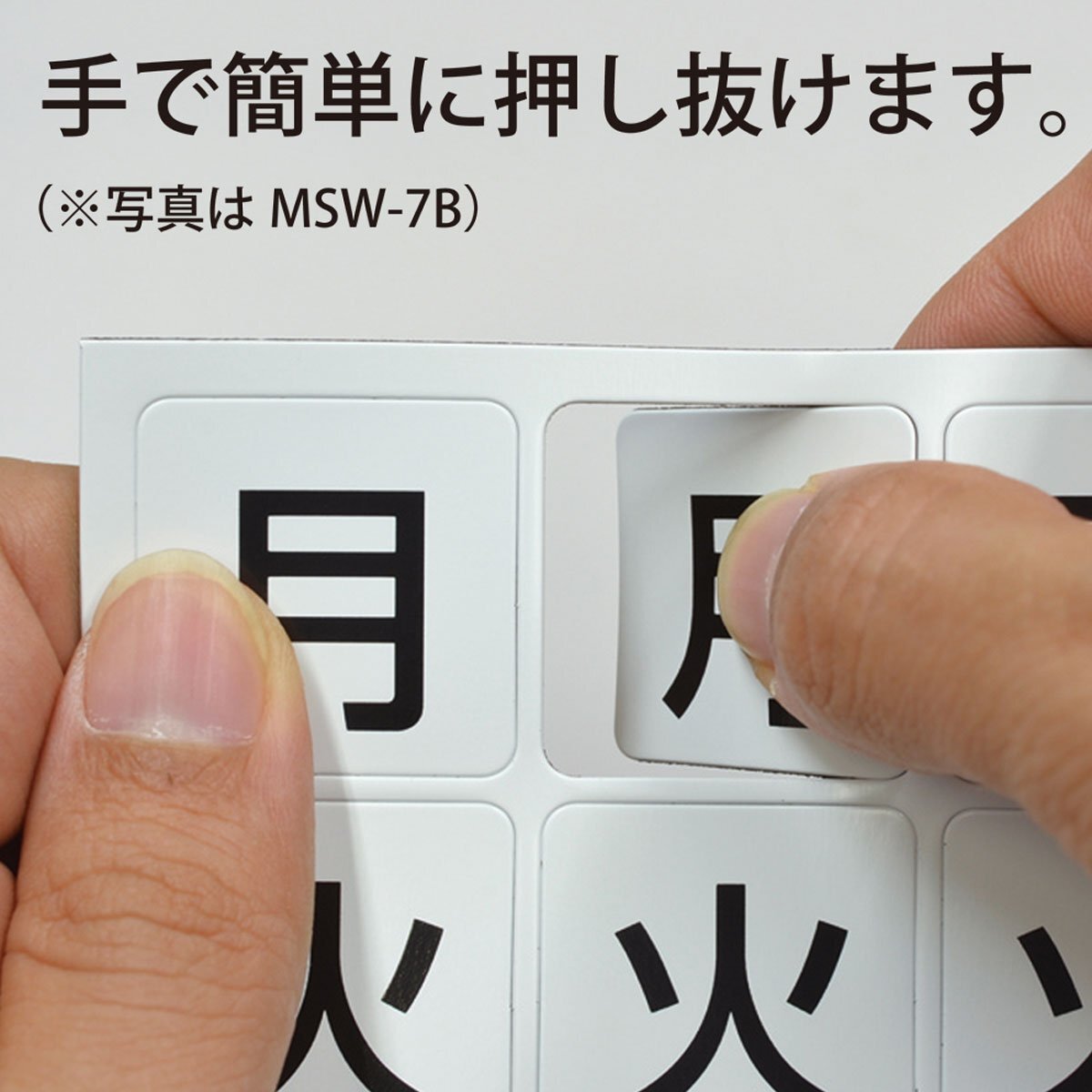 ウィークシート(特大)・ 特大 MSW-7LL・Style:ウィークシート(特大)・W194mm×H276mm×T0.5mm(1マス:36mm×36mm)・【サイズ】0.5×194×276mm・【曜日1個サイズ】0.8×左右36×天地36mm・【仕様】5週間分・【材質】PVC マグネットシート説明 商品紹介 大型のスケジュールボード、ホワイトボード用の曜日表示マグネット。 枠から抜いて貼るだけなので簡単に使用できます。 ●日時の指定は承れません。ご了承ください。
