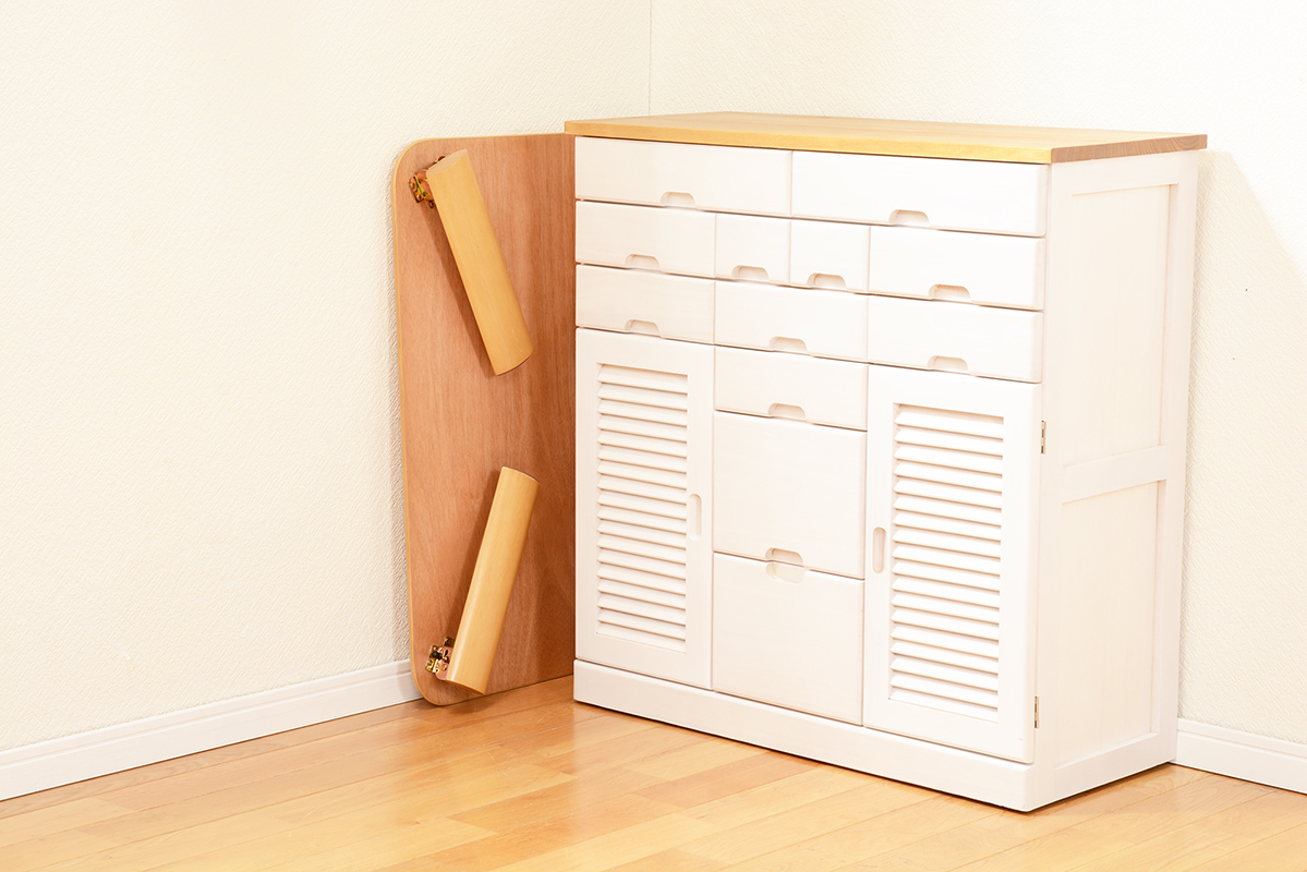 来客時に補助テーブルとして出したり、コンパクトに収納したりと便利な折れ脚テーブル。