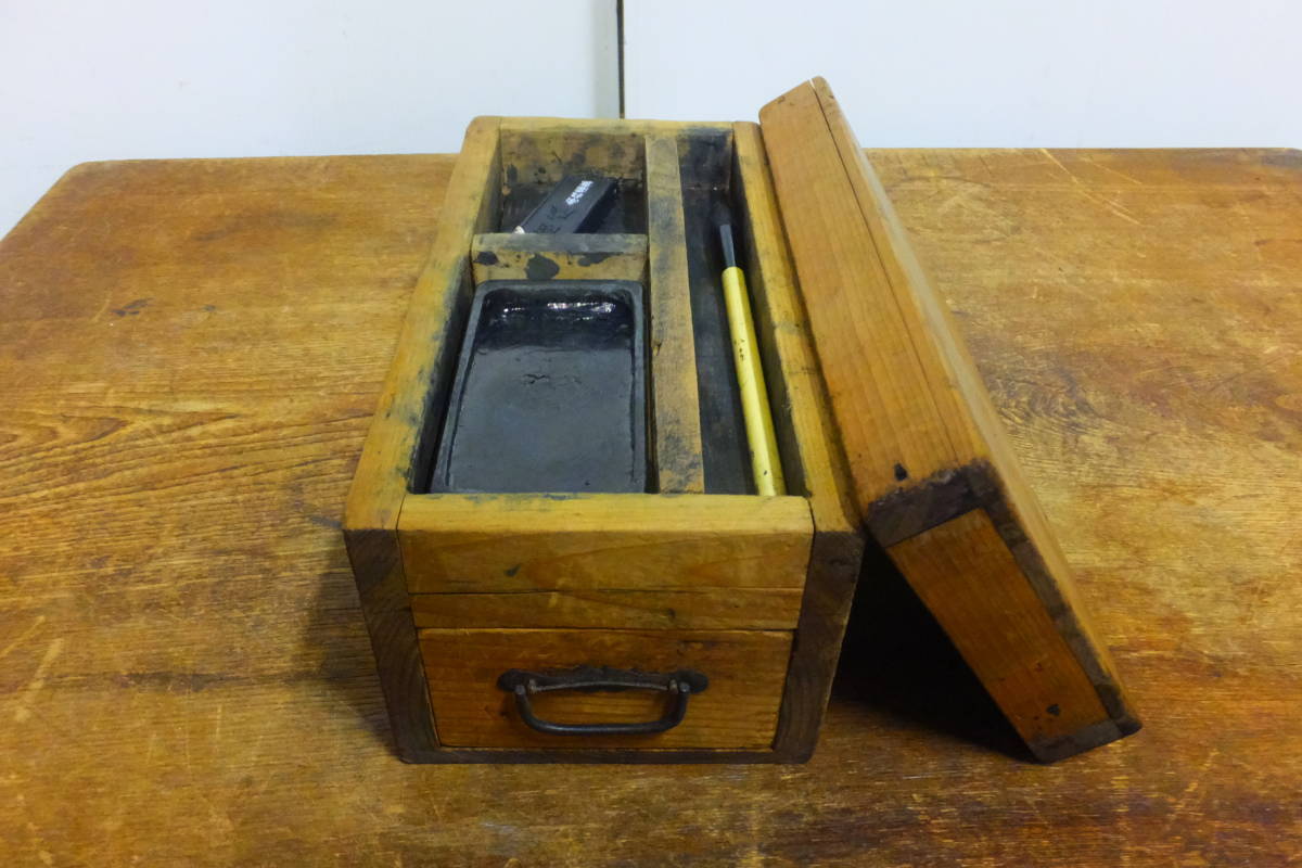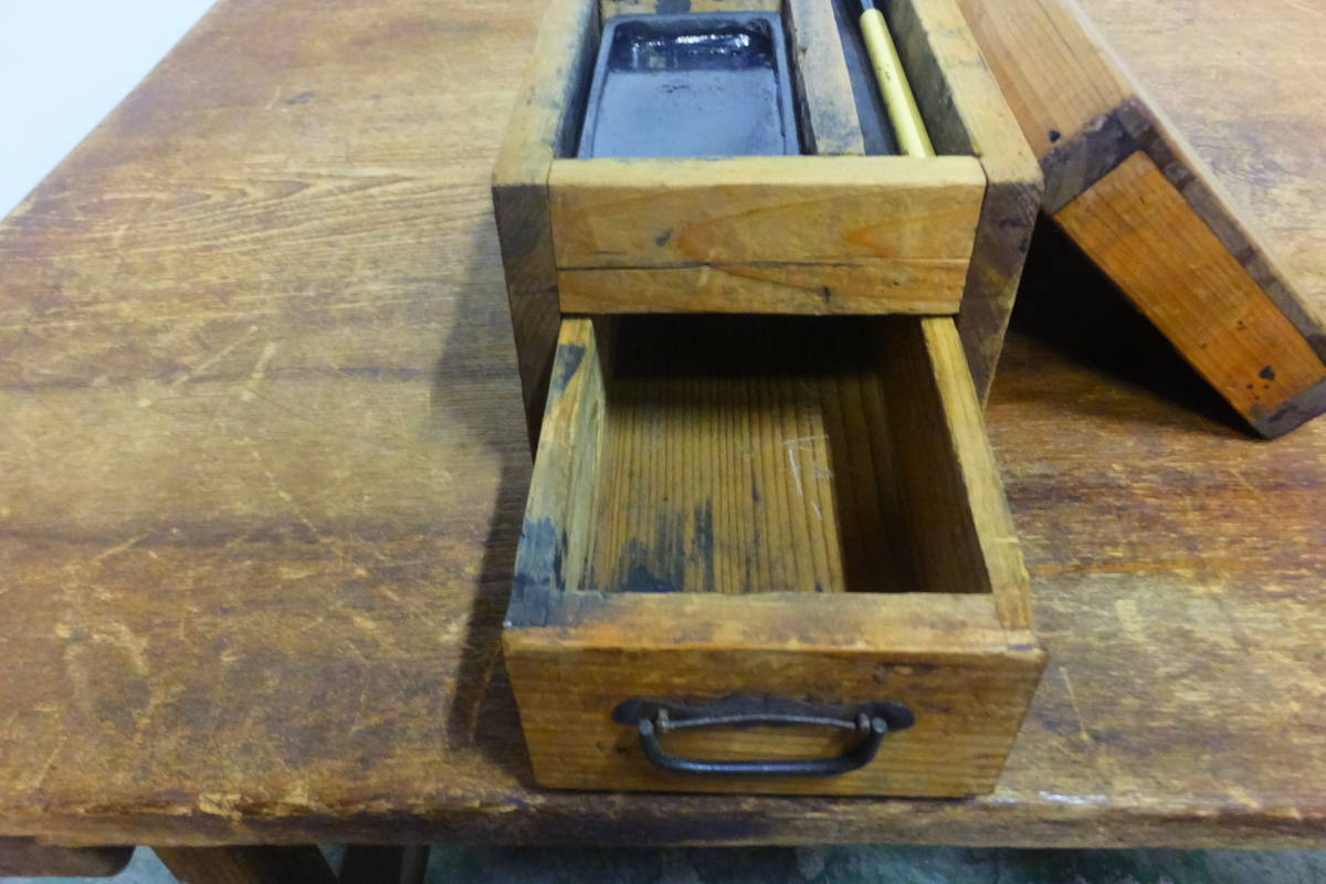 ▲ろ-176 書道具 一式セット 時代物 中古 すずり 炭 筆 箱:引出し付 箱:高13 横13 奥26cm 重さ14.5kg