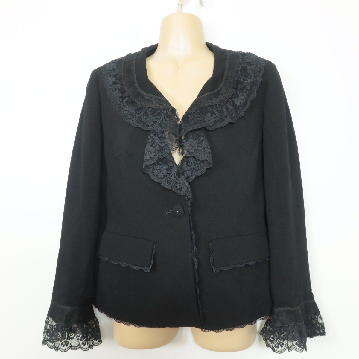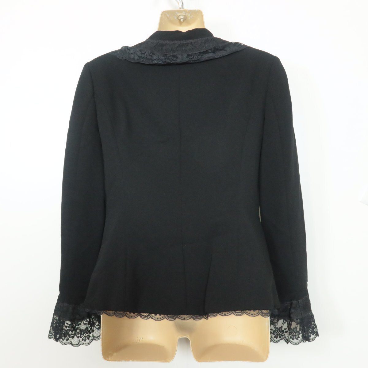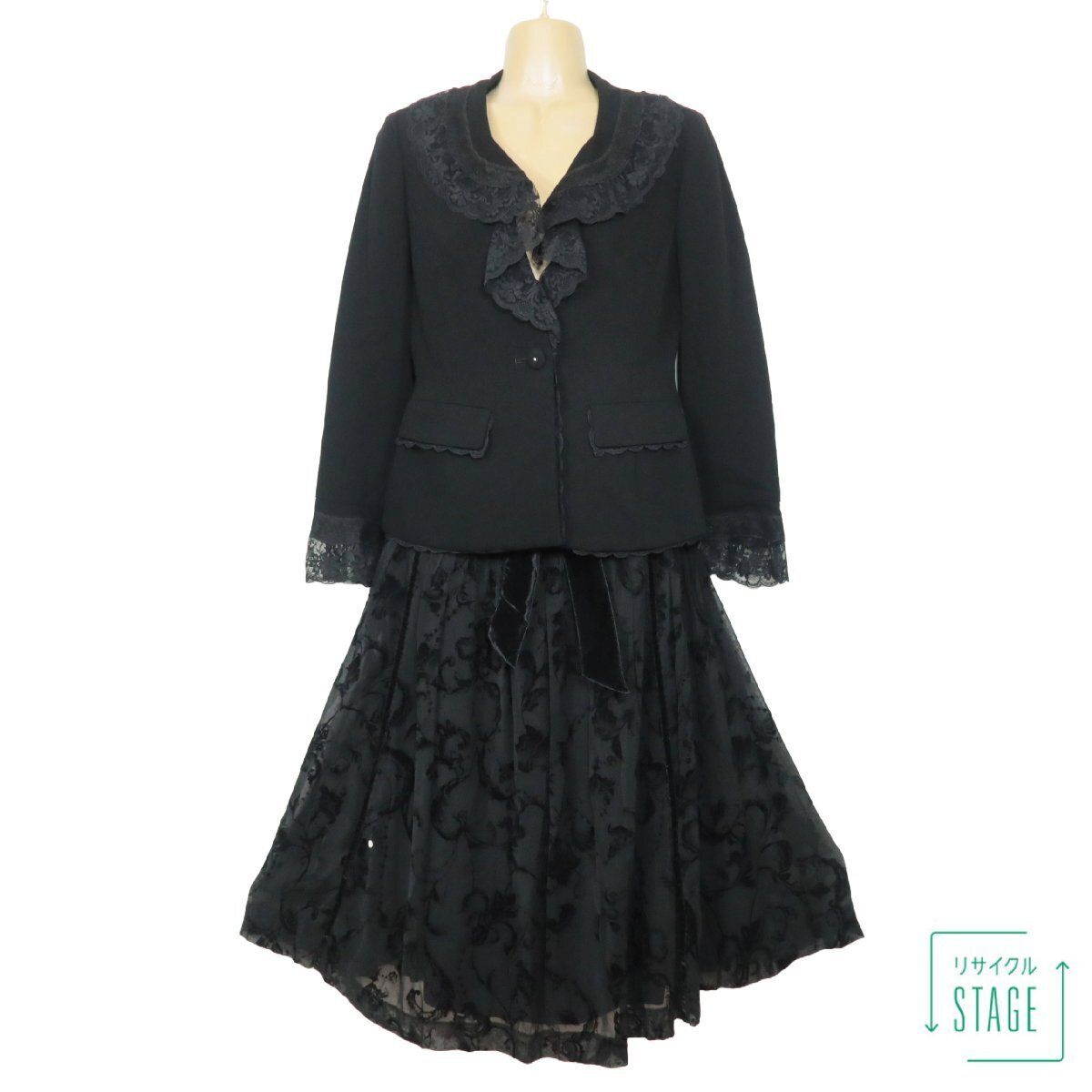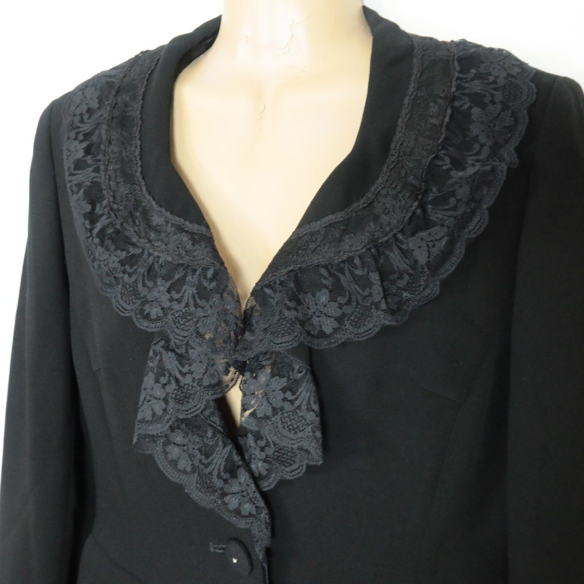 商品説明 | 【実寸約】 肩幅38袖丈58バスト86着丈55.5 (cm) ウエスト67丈79 (cm) 【サイズ表記】 S 【素材】ポリエステル100% 【状態】普通の使用感のあるお品物 ところどころフロッキープリントが薄くなっています。 【デザイン】 ブラック系 大人フェミニンなスーツです。 ジャケットとフレアスカートの組み合わせ。 セットでも単品でもロマンティックコーデに大活躍するアイテムです。 <ジャケット>一つボタンで、襟や袖にレースがたっぷりあしらわれています。 前立てやポケットのフラップの裏もレース付き♪ 肩パッドあり。ロゴ入りの裏地付き。 フラップポケット2つあり。 <スカート>上部にぐるりとピンタックが入っています。 花模様のフロッキープリントがおしゃれ! ベルトループ&ベロアのベルト付き♪ 裏地あり。ポケットなし |