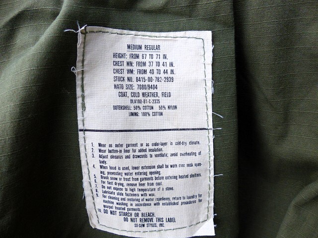 程度は実際に米軍兵士が使用したUSEDが使用感は少なく生地はまだしっかりとした張りがあり袖口などは擦れによるダメージはなく目につく破れや補修や汚れなどはありません。