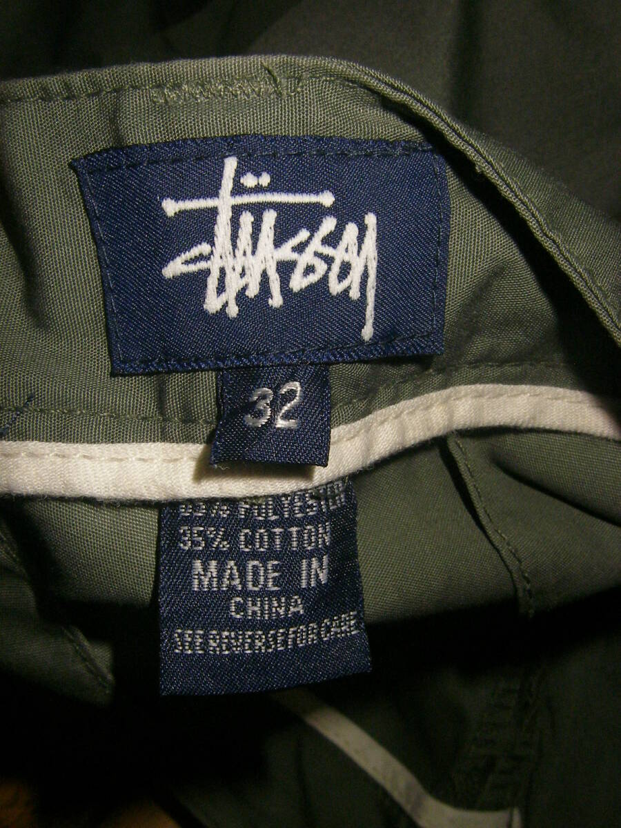 90s00s、ステューシーのカーキ、グリーン系のカーゴパンツ(ZIP,ワークパンツ)です。コットンポリエステルのいい生地です。サイズは、メーカー表記W32で、平置き採寸で、ウエスト43、5センチ、前股上33センチ、股下78センチ、太ももあたり30センチ、裾幅24センチです。素人採寸ですので多少の誤差はお許しください。使用感少なめで、特に大きなダメージも無く、まだまだ着用して頂けるかと思います。あくまで、USED品ですので神経質な方、古着のご理解のない方入札お断りです。