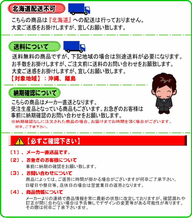 | 重量物や長尺商品につきましては、お届先の道路状況やメーカー提携運送会社の 配送車両の関係でご指定ご住所まで配達が出来ない場合がございます。 該当商品をご落札予定の場合は事前に配送が可能かのお問い合わせを頂ければと 思います。 |