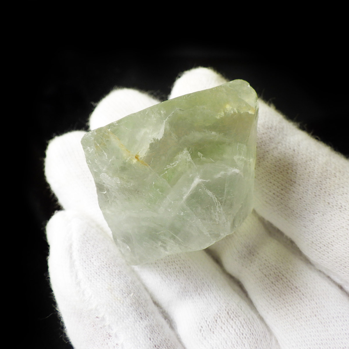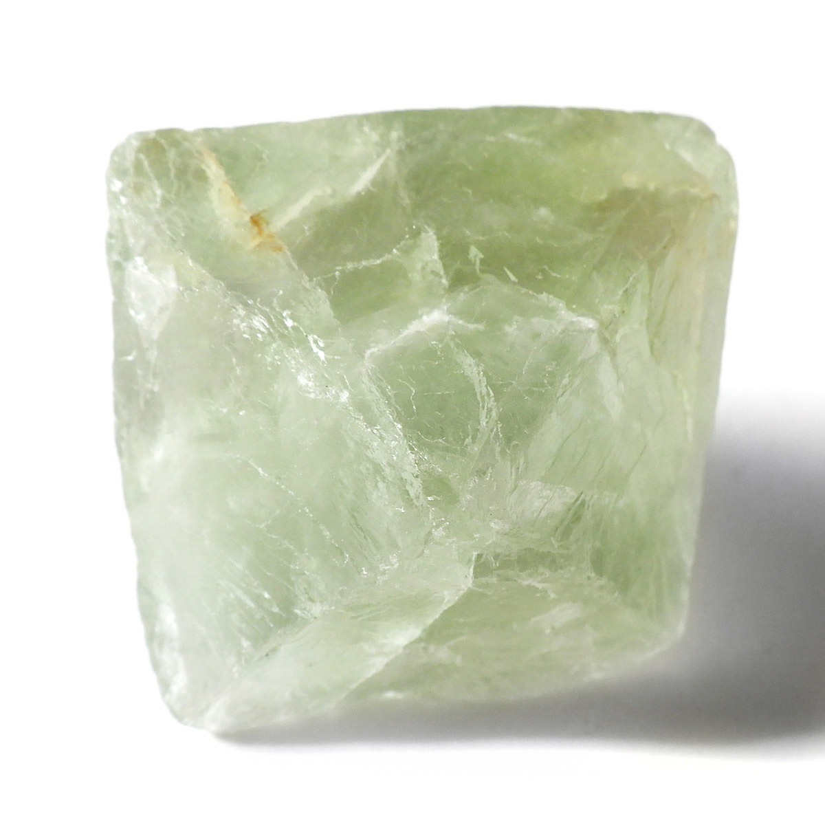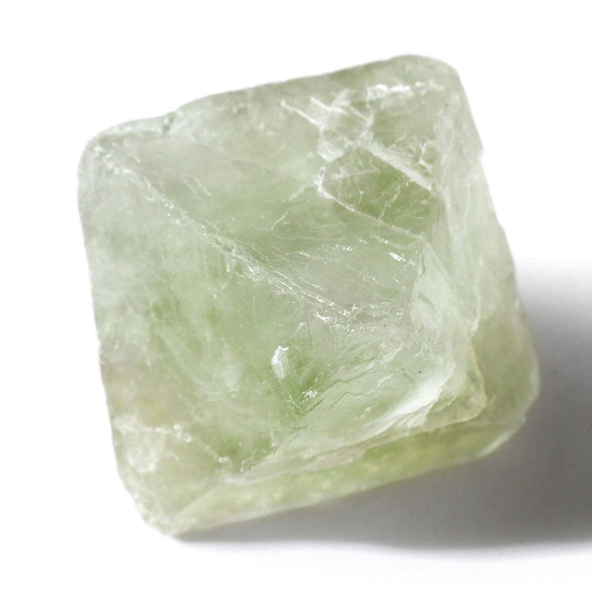 チャイナ産の八面体フローライトです。この正八面体の形は、蛍石が平面に平行に割れやすい性質を利用して加工したものです。光に透かすと一層の美しさです。