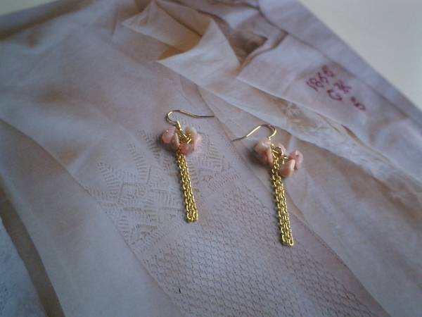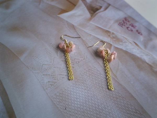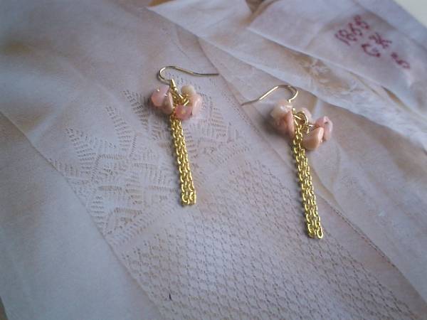 ネオ・ロマンチック・・シリーズです♪モンローに憧れて・・シックなピンクオパールのさざれのピアスです♪6ミリから9ミリ位までのやさしい風合いのさざれを繊細なチェーンに合わせてロマンチックな表情です♪長さは全長6センチ位です♪イヤリングにも変更出来ます♪お揃いのネックレスやブレスレットも出品しています♪シンプルで飽きのこないいつまでも着けられるデザインを考えて作りました♪ハンドメイドをご理解頂いてノークレーム、ノーリターンでお願いします