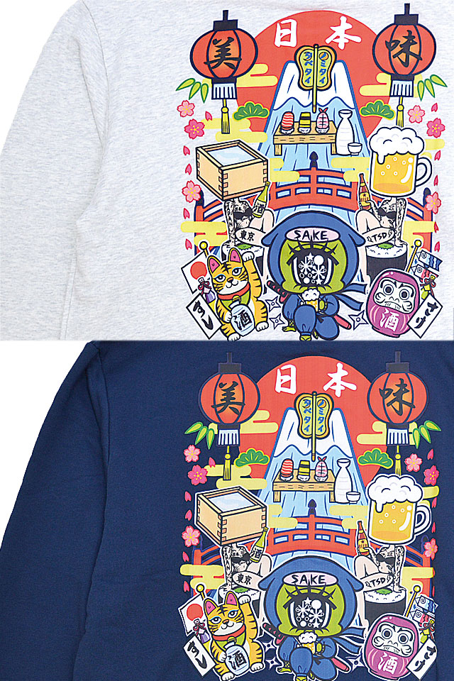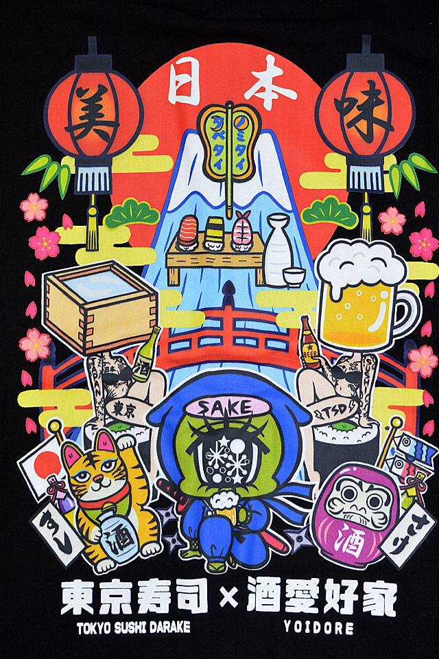 すべての酔いどれに届ける、酔いどれのためのブランド「YOIDORE」より「東京スシダラケ×YOIDORE スウェット(844505)」が入荷してまいりました。 派手POPイラストレーターのNABEYUKAがデザインする「Japanese DASAII」(ジャパニーズダサ良い)をテーマにしたブランド「東京スシダラケ」と「YOIDORE」のスペシャルコラボレーション企画! 寿司と酒をテーマにしたYOIDOREとのコラボ企画が遂に始動しました! 今回のコラボレーションのためだけに特別に書き下ろした完全オリジナルイラスト仕様です。 右袖には世界各国の乾杯がプリントされており、万国共通なボーダーレス感をアピール。 インパクト抜群のバックプリントに視線はクギ付け必至です。 NABEYUKAの独特のイラストとYOIDOREの世界観がゆるっとMIXされた至高のアイテムに仕上がりました。 ややゆったりめのルーズなシルエットは適度なリラックス感があり、ラフな呑みシーンでのコーディネートに取り入れたいマストなアイテムです。 | ||||||||||||||||||||