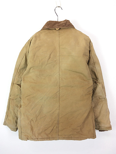 襟コーデュロイ、フロントはジップとベルクロの二重構造、ウエスト内側にドローコード、裏地は中綿入り黒のナイロンキルティング、袖内側リブ付きで防寒性も期待できます。