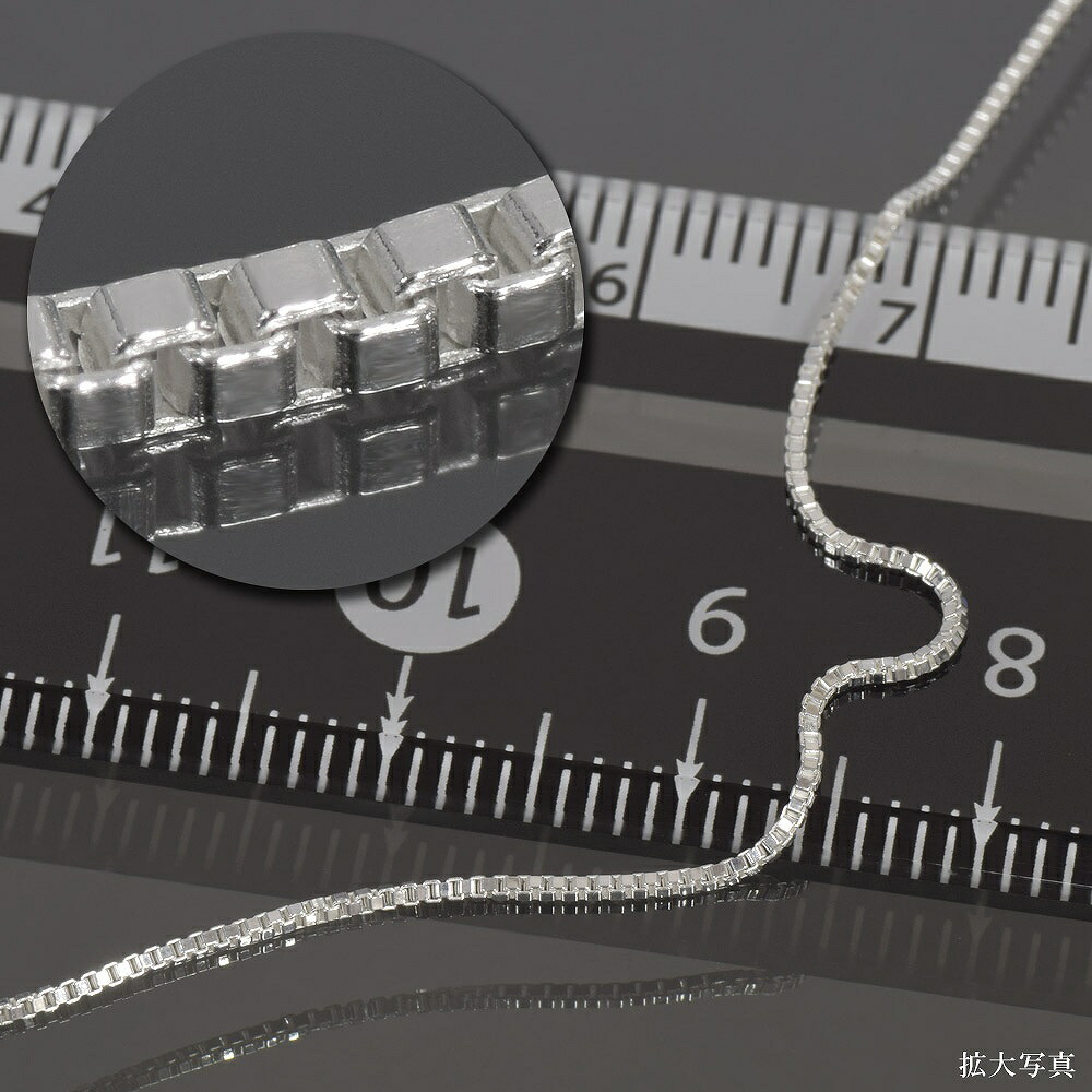 | ベネチアンチェーンは正方形のコマが連なったデザインの定番チェーン。キューブ状のパーツが密に連なったボリューム感のあるデザインが特徴で、丈夫で切れにくいチェーンのひとつです。また、構造上絡まりにくく、万が一絡まった場合でも解きやすいチェーンです。ベネチアンという名前は、イタリアの都市ベネチアの家々のボックス型の窓の形に由来していると言われていますが、リンクスチェーン、ボックスチェーンといった名称で呼ばれる事もあります。 |