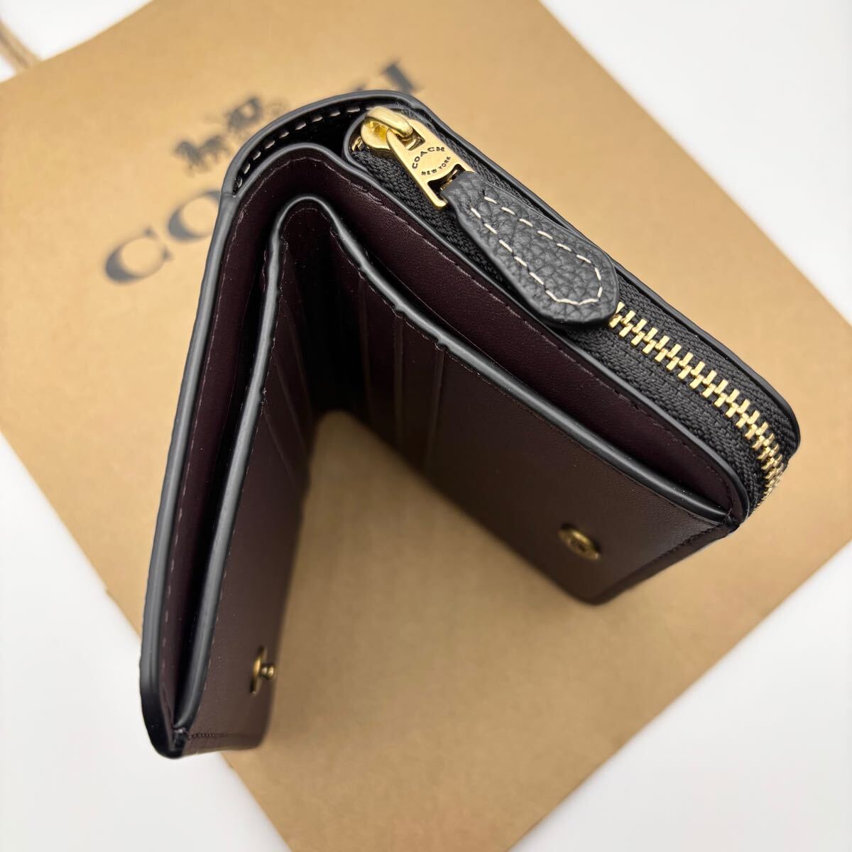 ポリッシュド ペブル レザーの二つ折りミニ財布。3辺に大きく開く小銭ポケットは、レシートやイヤフォンの収納にも便利な仕切り付き。スナップを外すと、6層のカードポケットと札入れが広がります。