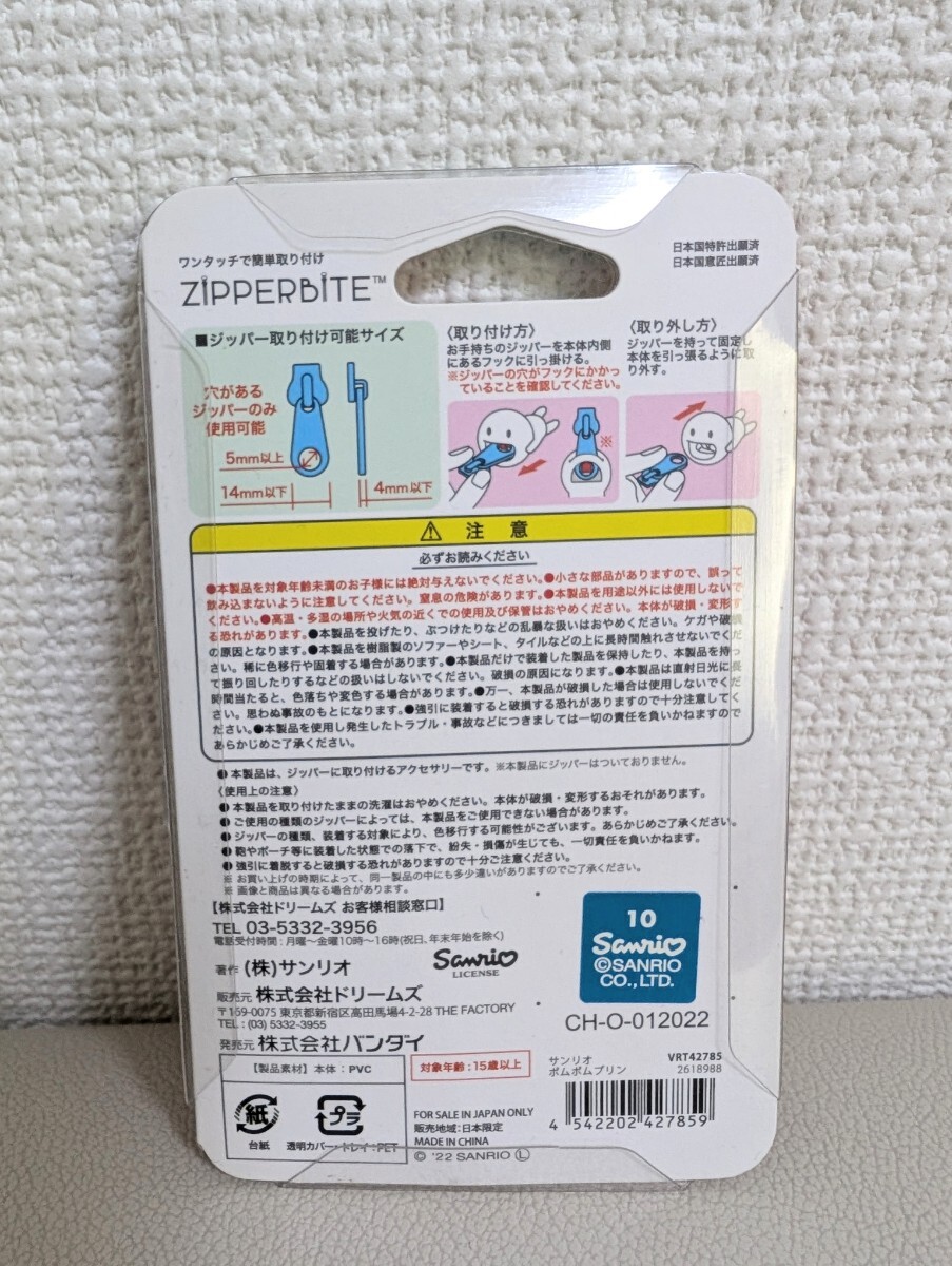 ファスナーアクセサリージッパーバイトのポムポムプリンです。