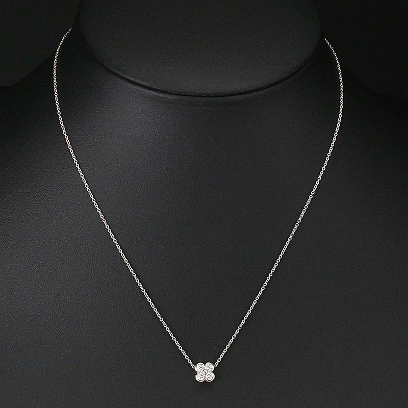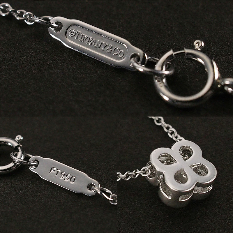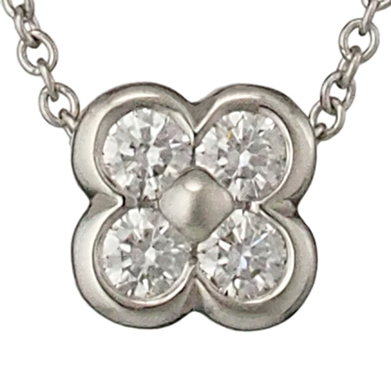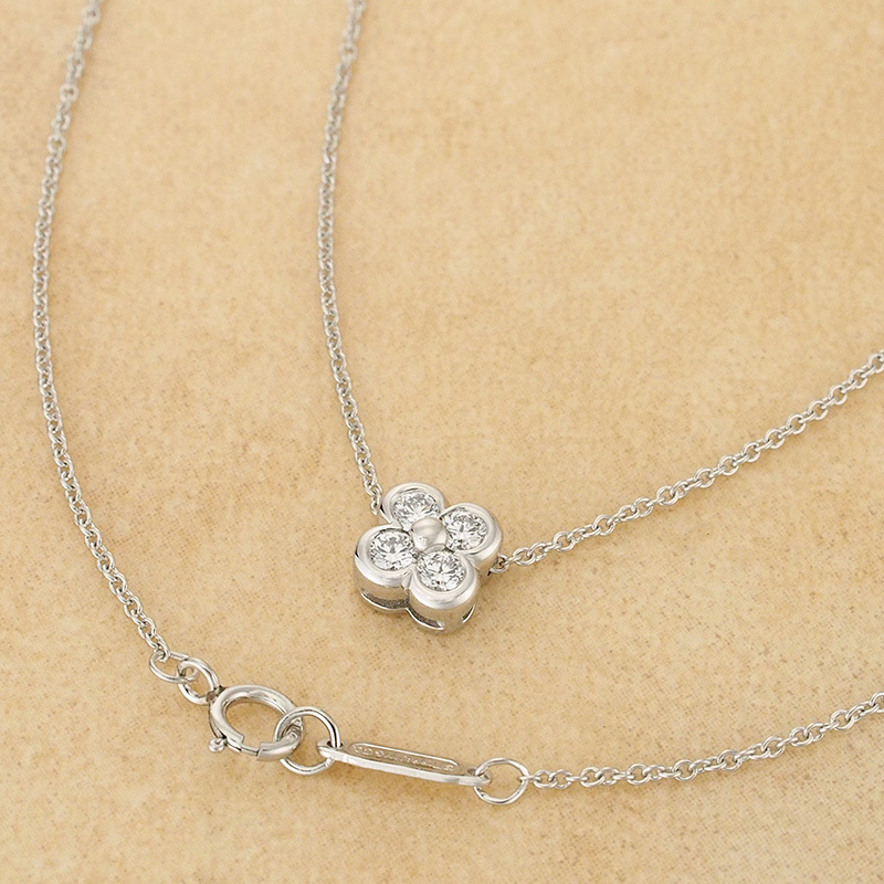 備考:プラチナ950製のフラワーモチーフに厳選された美しい輝きの4粒のダイヤモンドをセットした、ティファニーの「ベゼルセット」ネックレスです。チェーンは取り外し不可。仕上済。