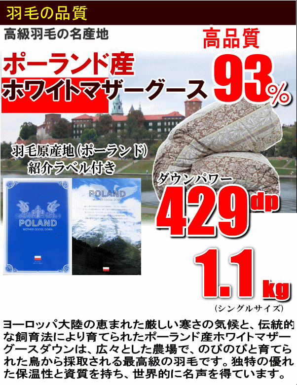 ■中身:ポーランド産ホワイトマザーグースダウン93% フェザー7%
