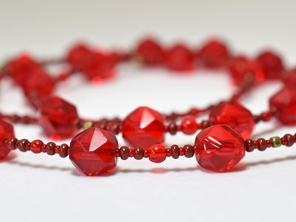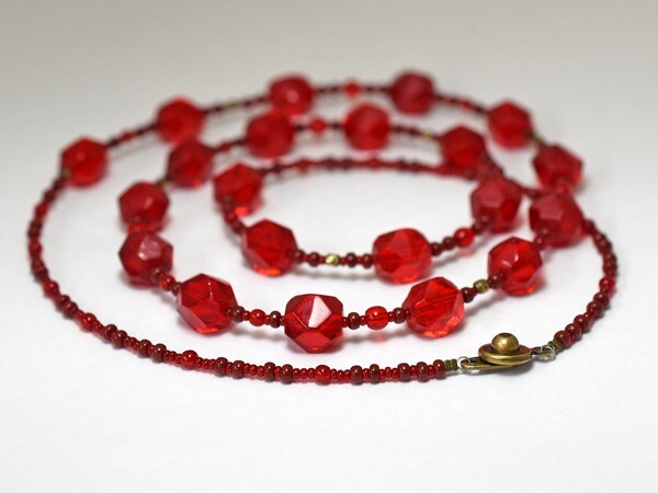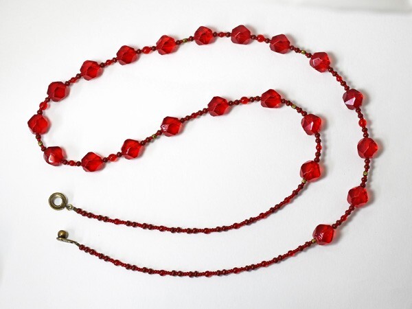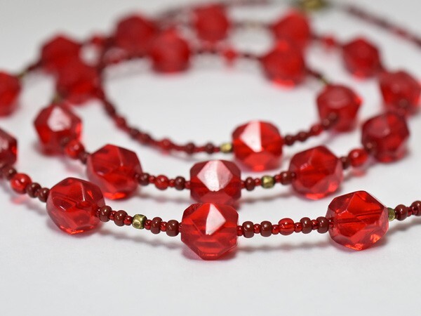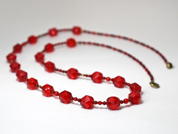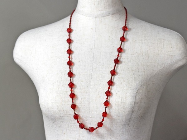 チェコ産のアンティークの半透明赤色多面カットビーズを繋げた当店オリジナルのネックレスです。燃えるような鮮やかな赤色の美しい1本です。やや長めの約74.5Cmありますので、留金を外さずに頭からすっぽり被って装着が可能です。留金は簡単に脱着が可能なボタン式を採用しております。