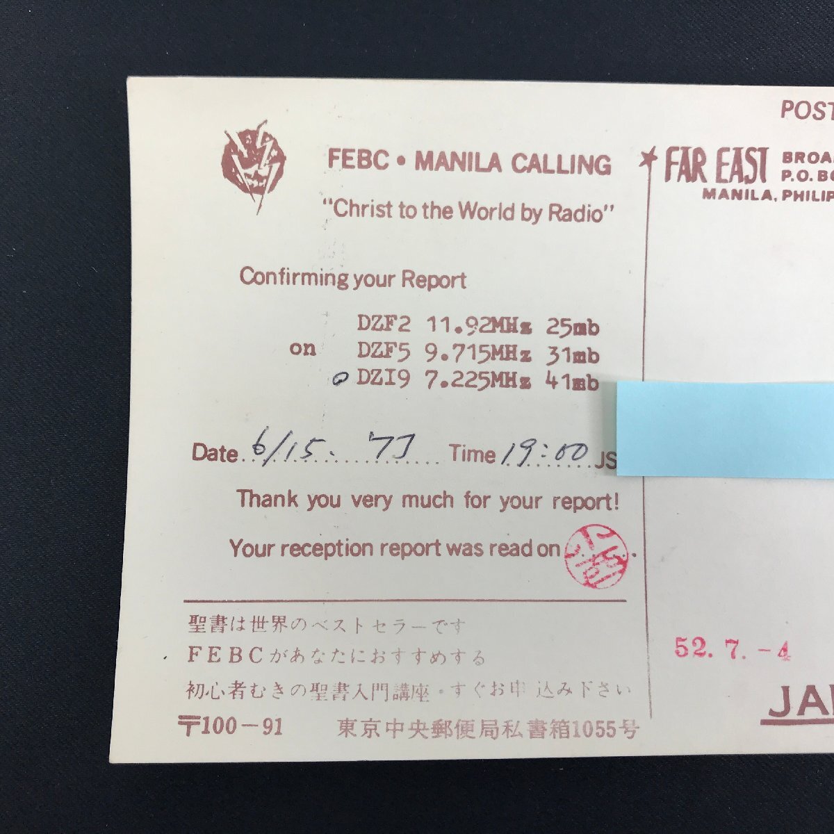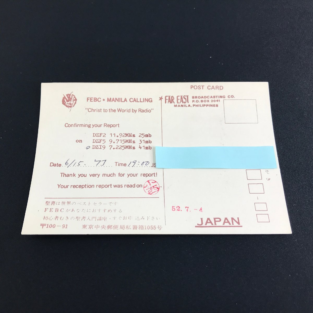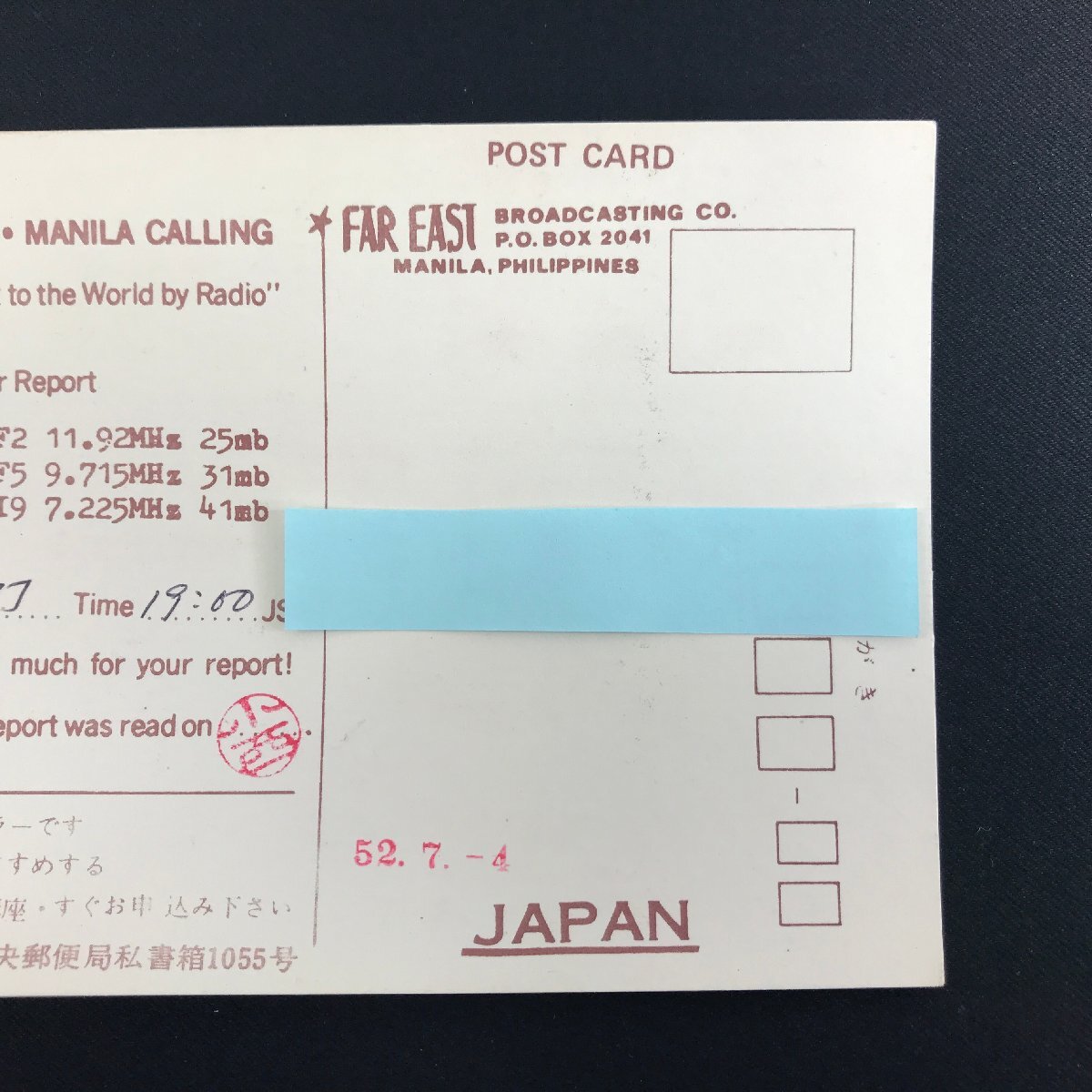 | ■商品名:ベリカード ■放送局:FAR EAST BROADCASTING CO. ■放送国:フィリピン ■年代:1970年代 ※出品商品は画像に写るものが全てとなります。 ※ハンガーやスタンド等、当店の備品を用いて撮影を行う場合がございますが、備品は付属いたしません。 | ||