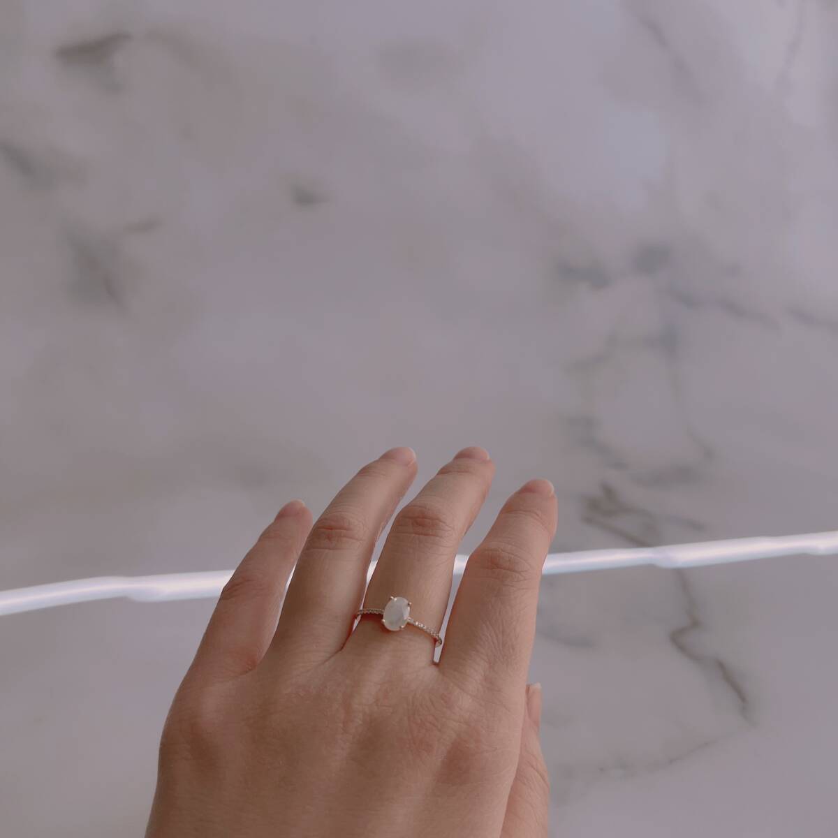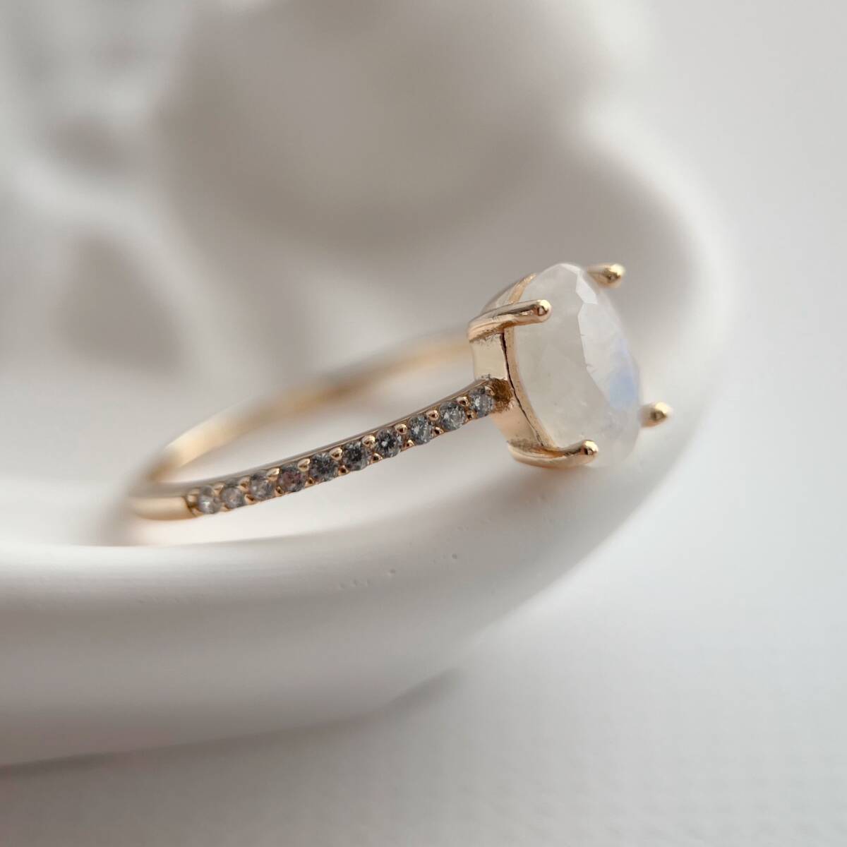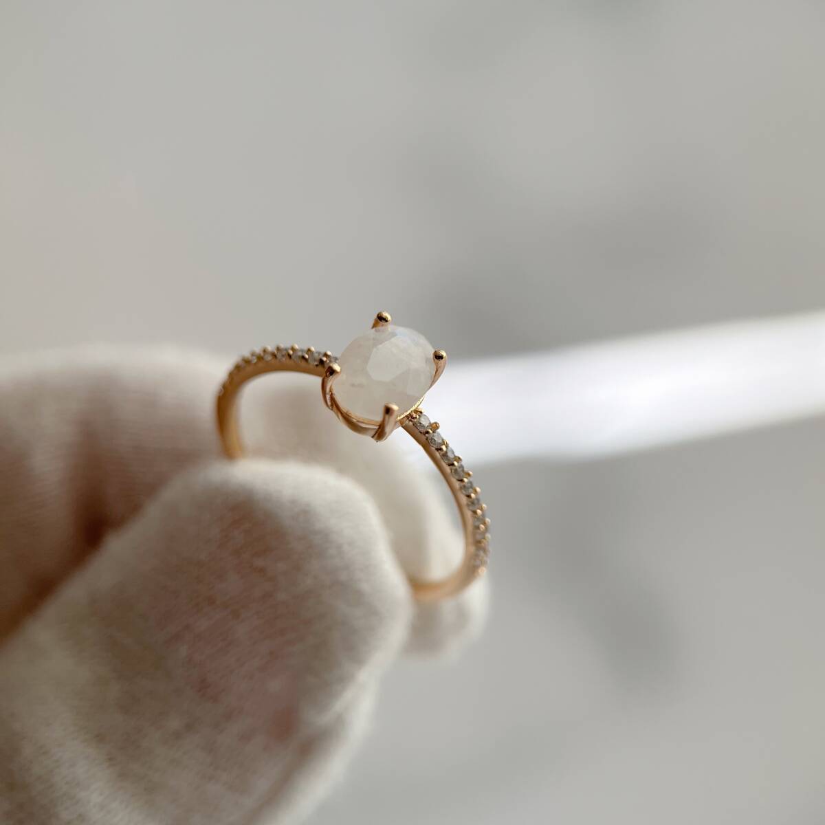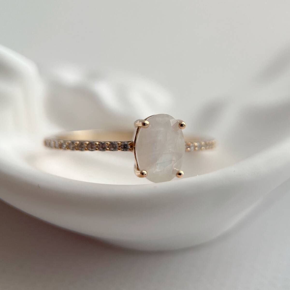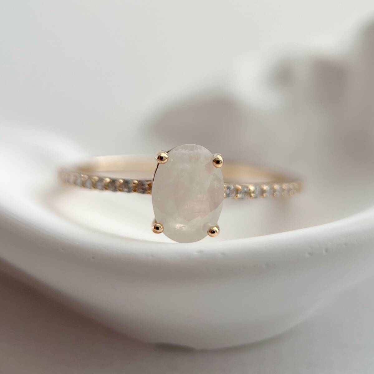 一粒のムーンストーンがセットされた、シンプルなリングです。