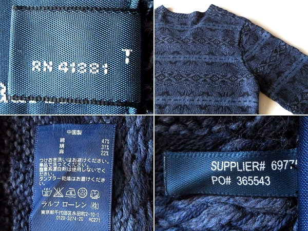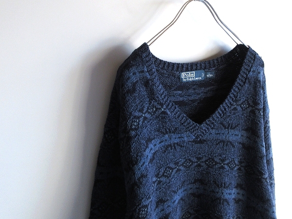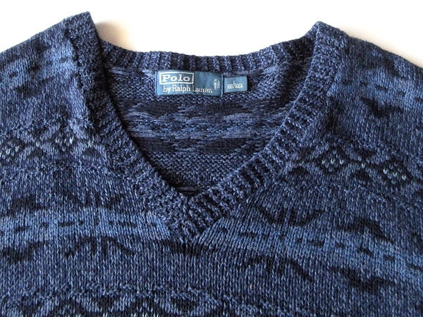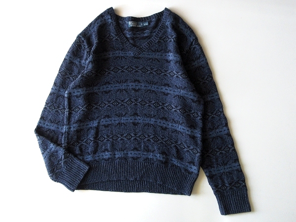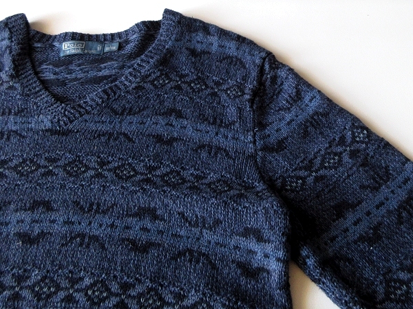 Polo by Ralph Lauren ラルフローレン コットンシルクリネン ネイティブ柄 Vネックニット セーター L ネイビー ブルー 紺 青 国内正規品