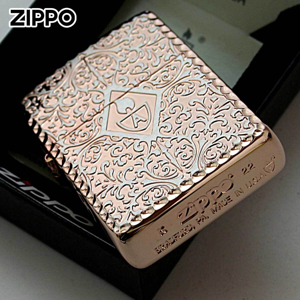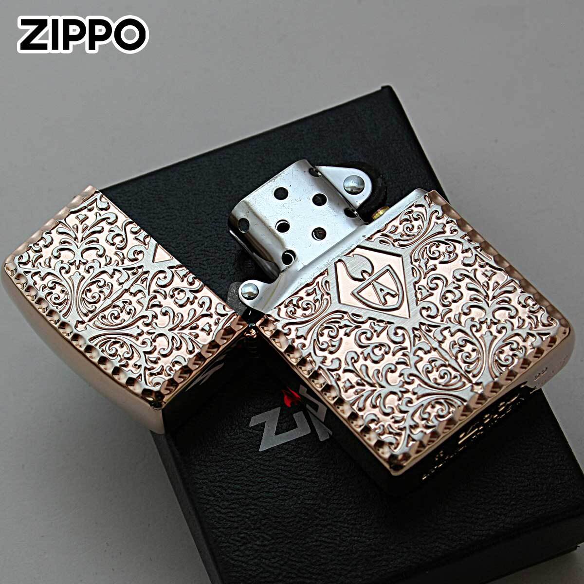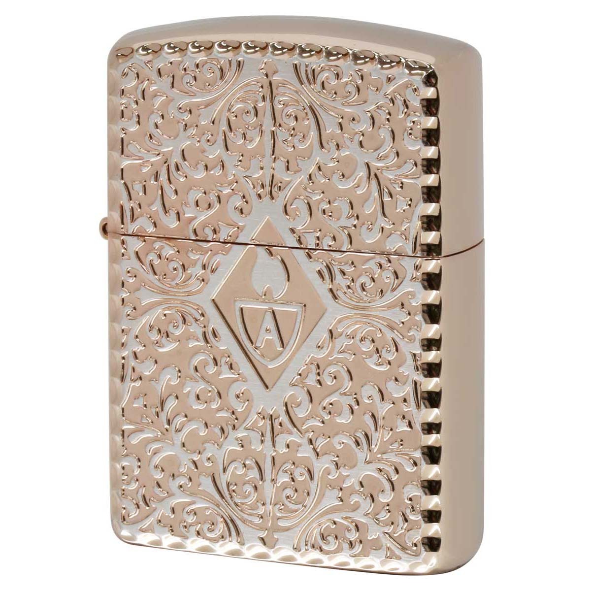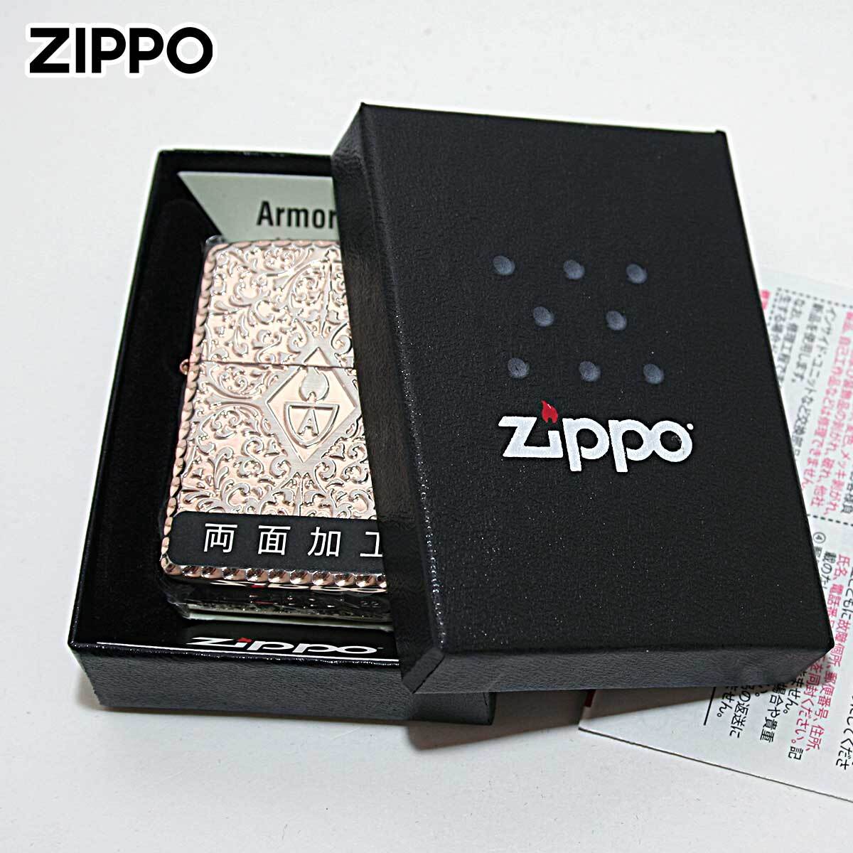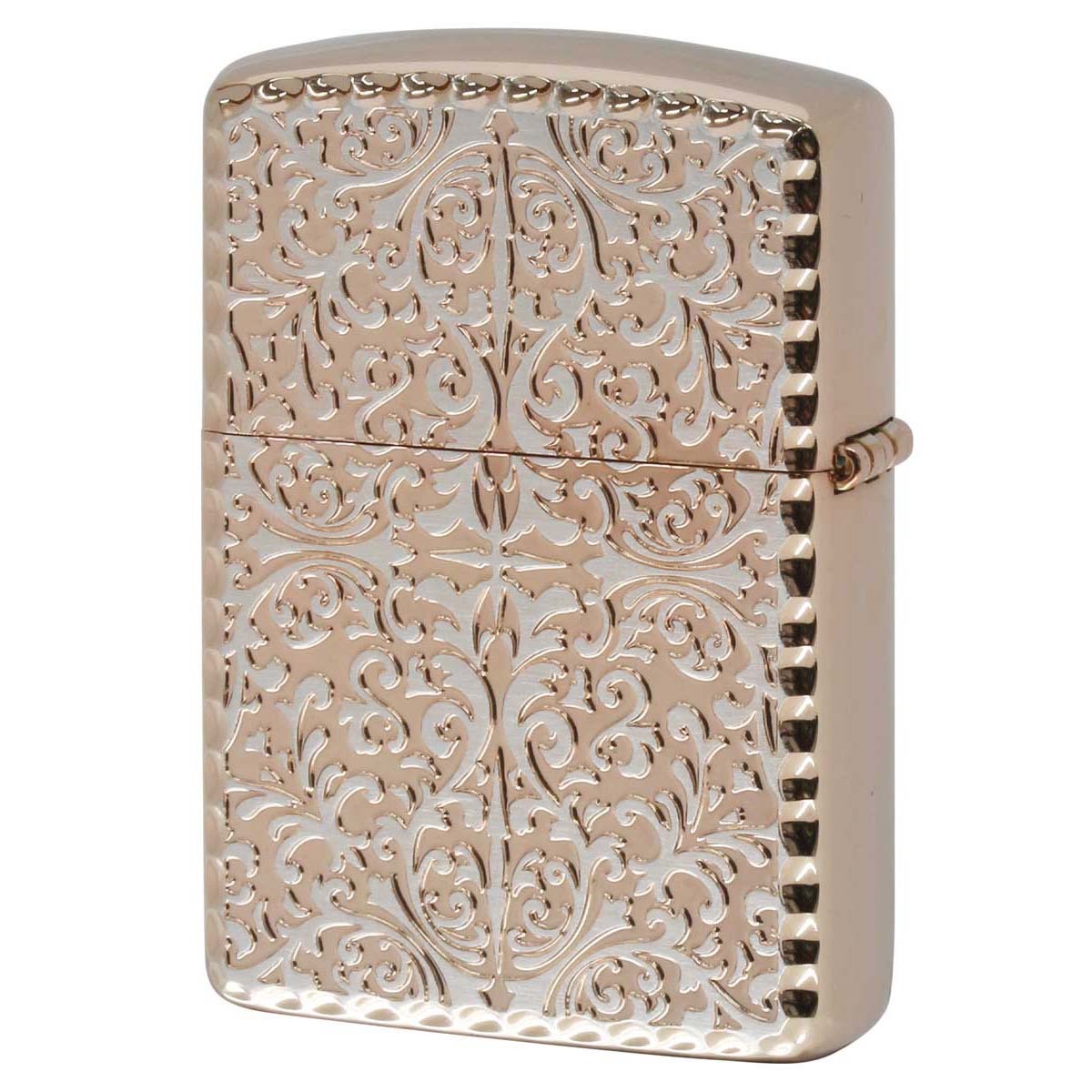 表面アラベスク柄の中心にアーマーロゴ、ケースの角はコーナーリューターカット加工、両面加工と至れり尽くせりのZIPPO。アーマーとは、レギュラーケースの1.5倍の厚みを持つケースのこと。デザインもゴージャスで華やか、高級感抜群の仕上がりです。フォーマルなシーンで活躍しそうな逸品!
