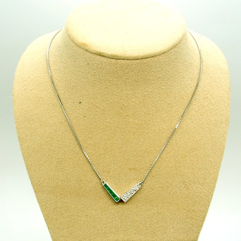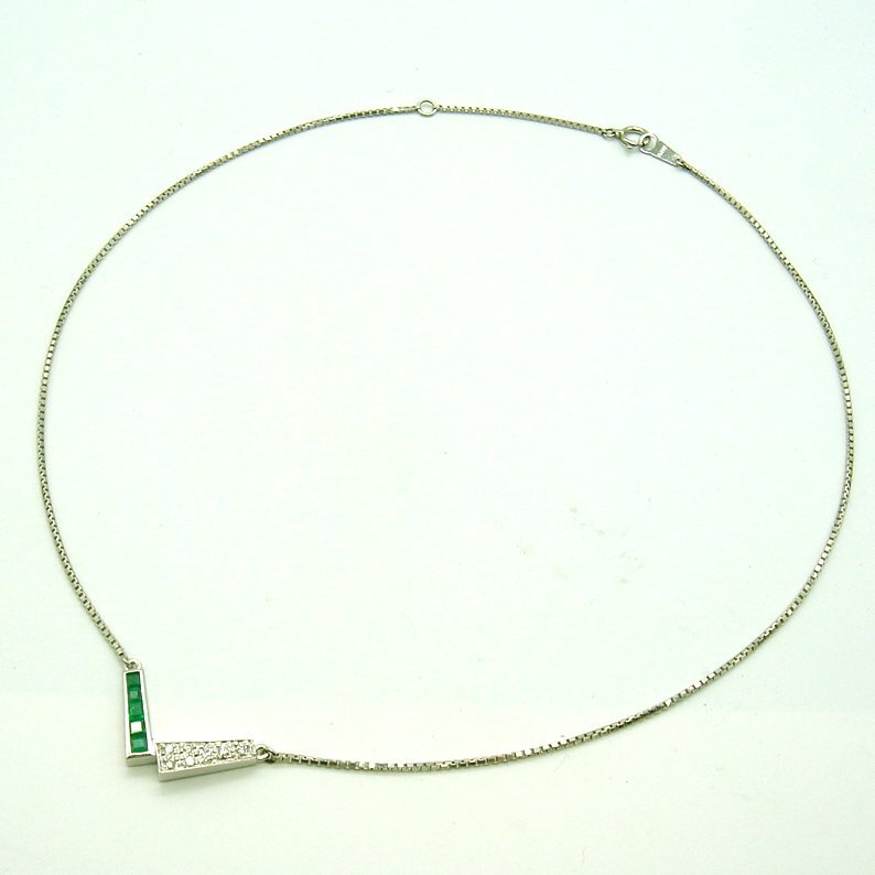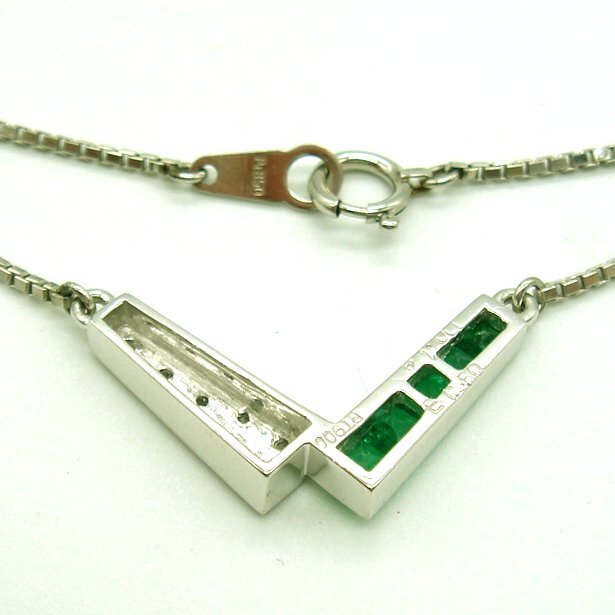 V字型の枠の左右にエメラルドの緑とダイヤの白(透明)ではっきりしたコントラストを出しています。