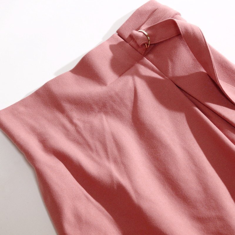 秋冬向きの厚みのあるポリエステルスーツ生地、ファスナーは後ろ中央、タイトめAライン、ウエストにベルト一体、ミモレ丈、ピンク系カラーが女性らしい1枚です。