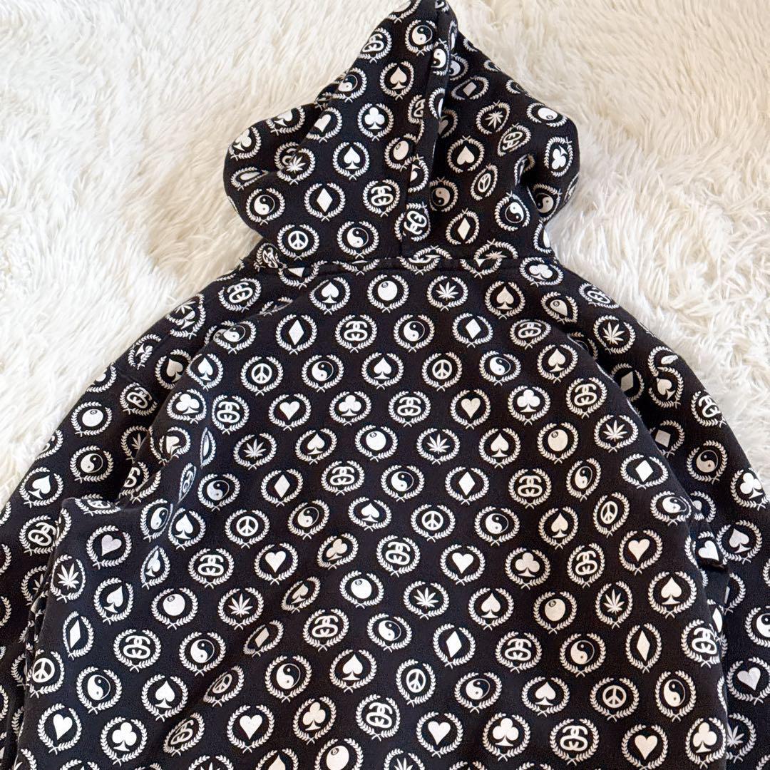 STUSSYの人気ロゴであるエイトボールをはじめとしてシャネル(SSリンク)、ハート、ダイヤ、クラブ、スペード、葉など様々な柄がプリントされている総柄パーカーです。