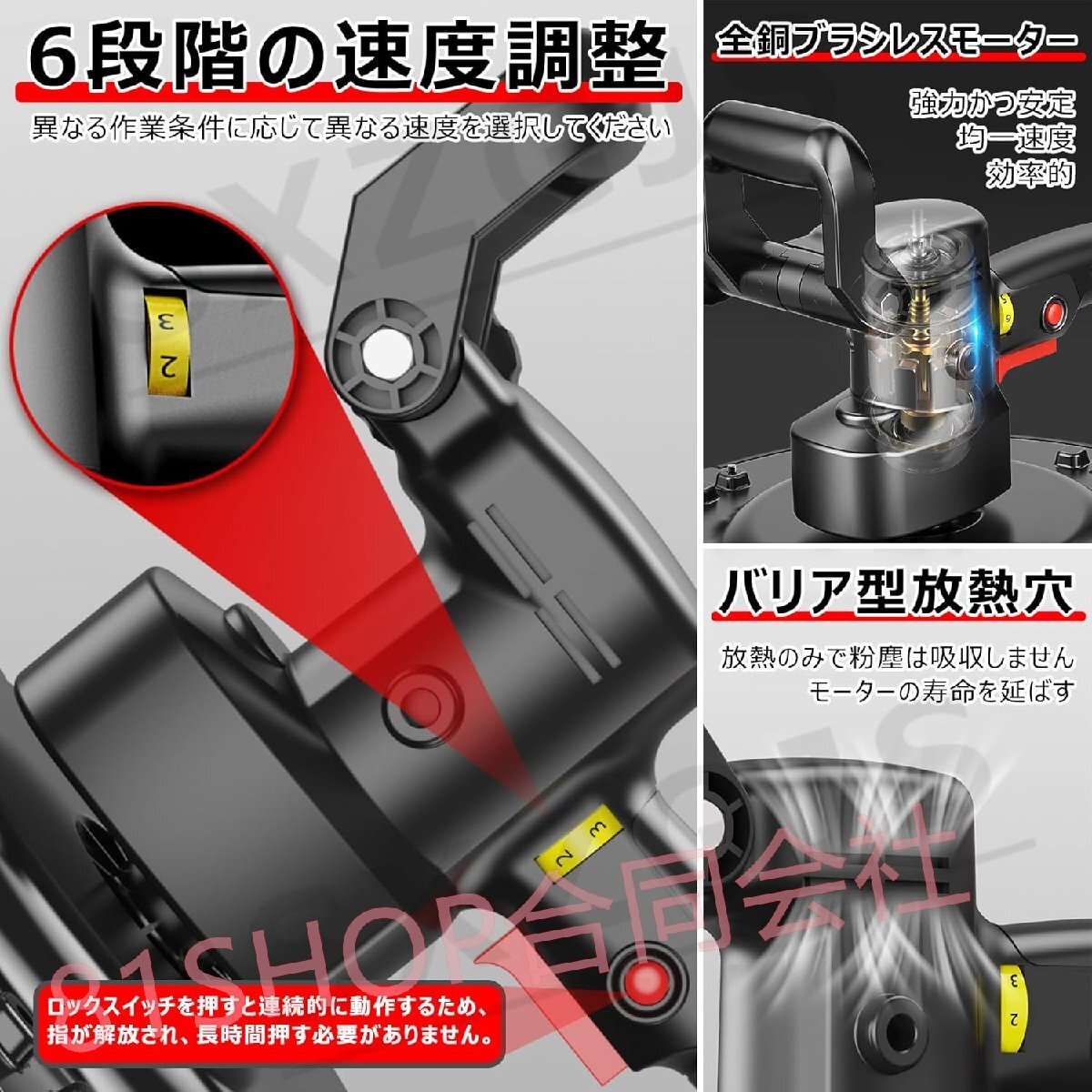 【全銅モーターと高効率バッテリー】:全銅ブラシレスモーター、安定した強力なパワー、均一な速度、高効率。 高品質の軸、機械全体の同心度が高く、安定した研削とブレがありません。 特別なバッテリー、エネルギー効率が 20% 向上、バッテリー寿命が長く、急速充電。 効率的な放熱により機械を保護します。