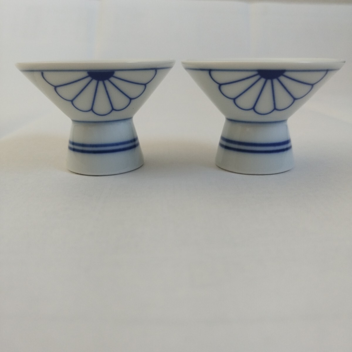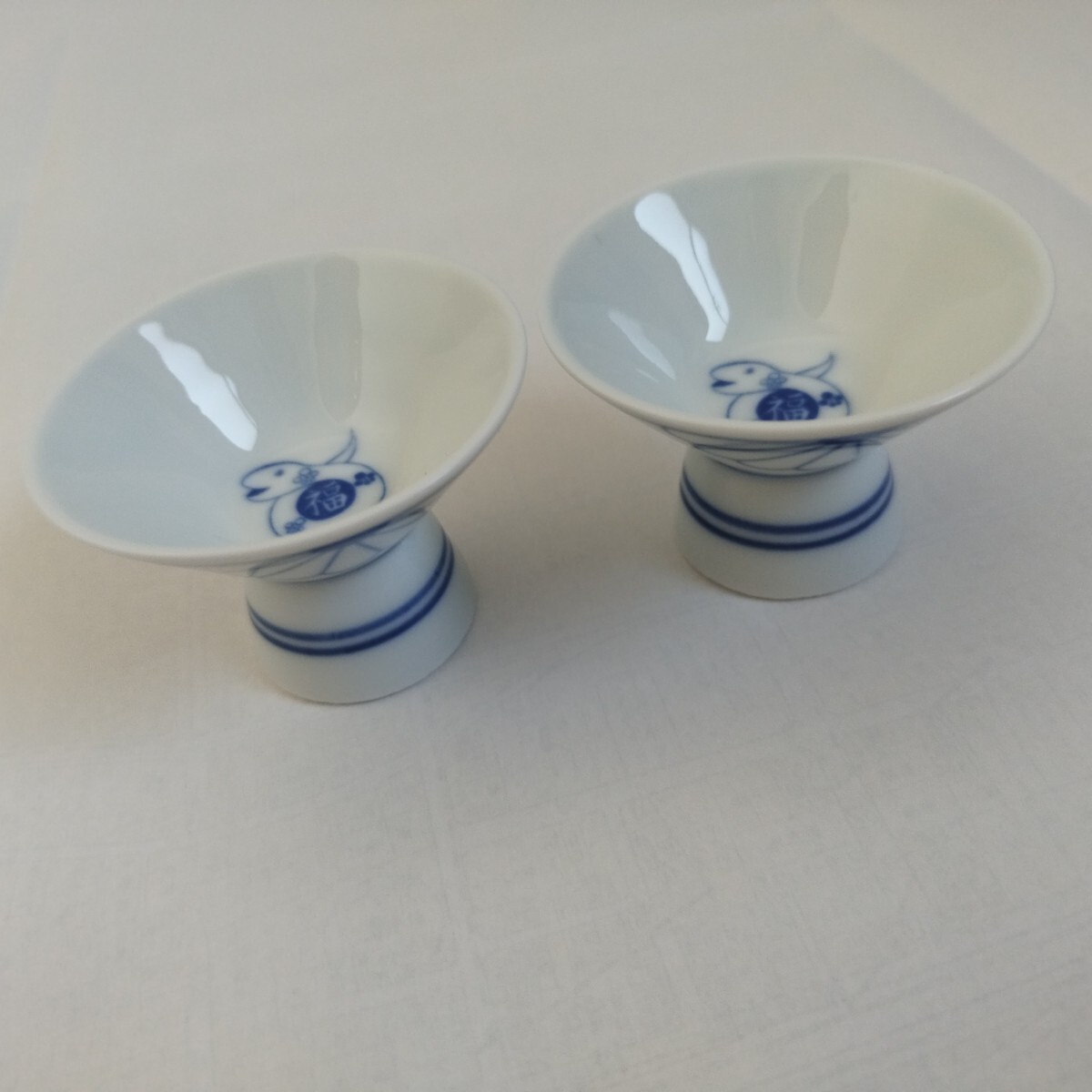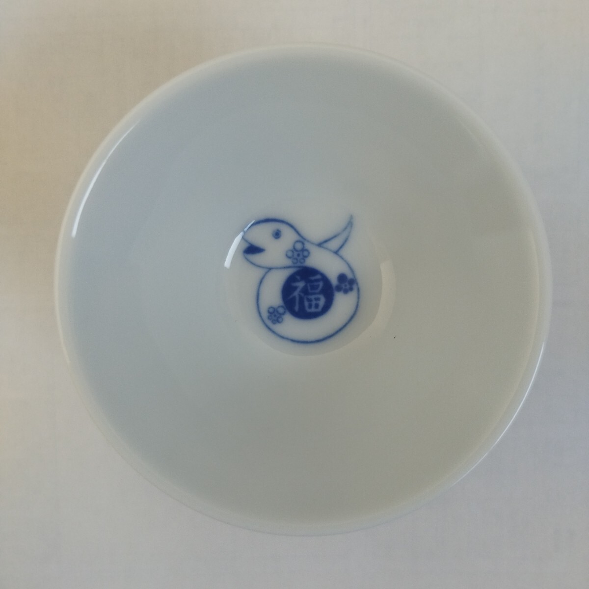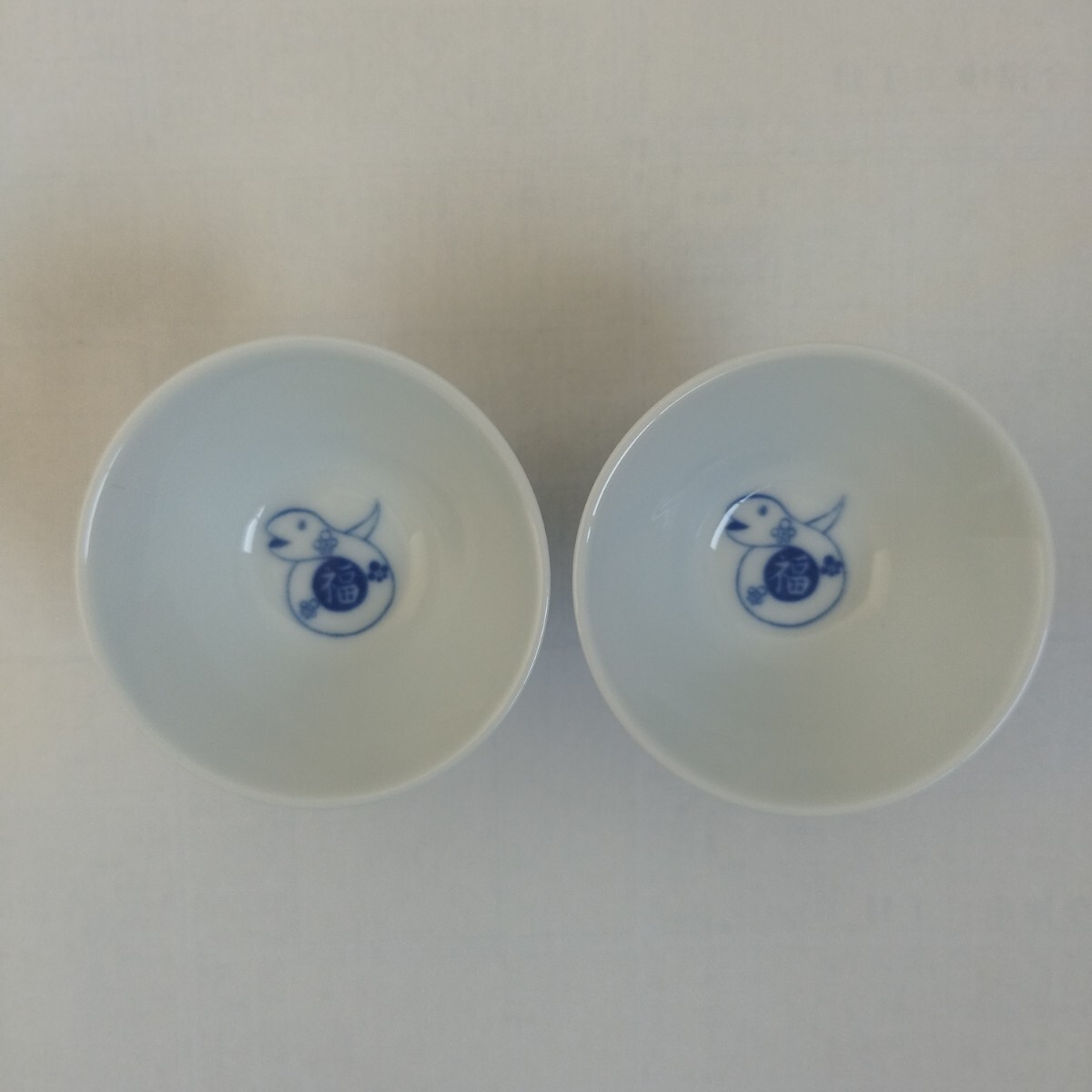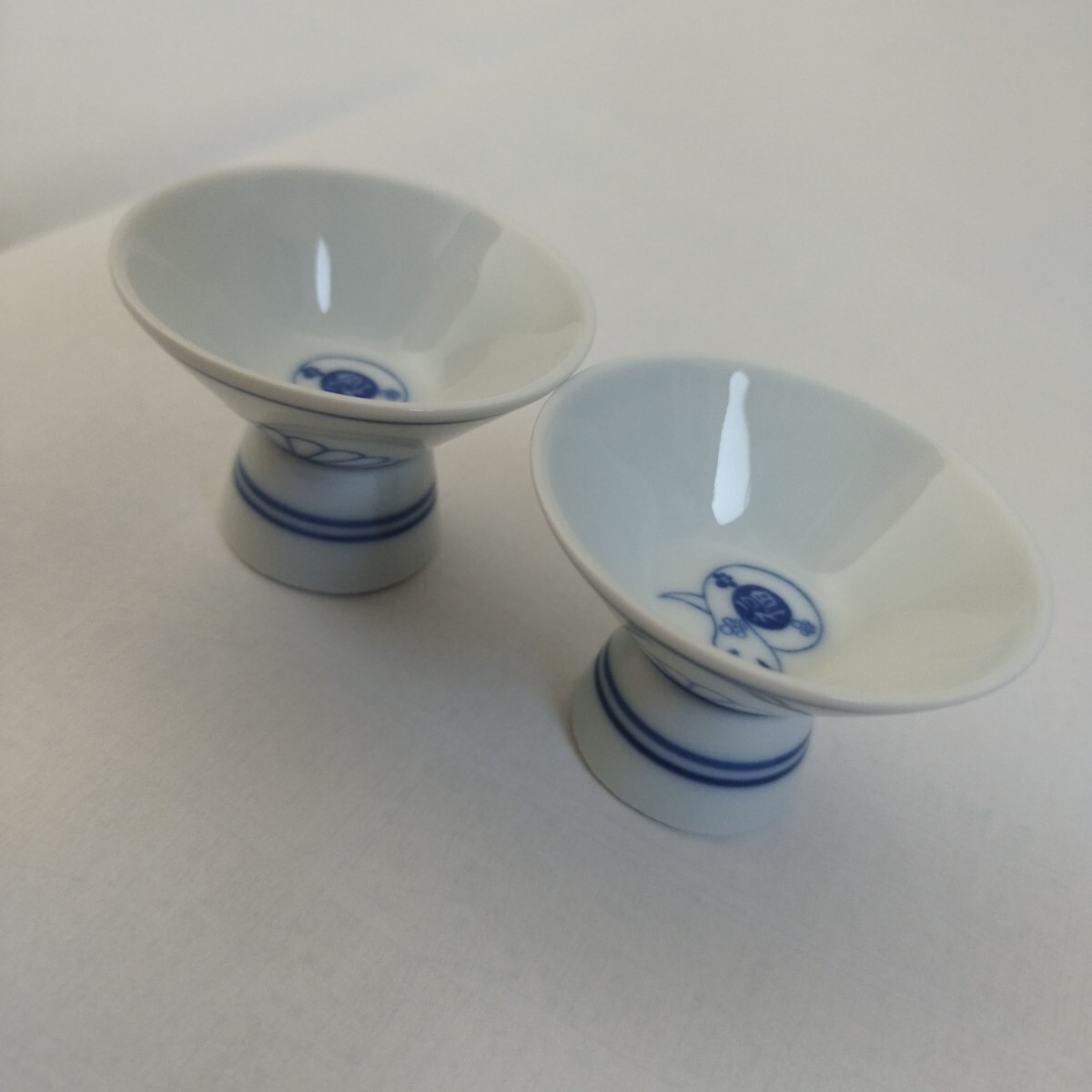 古代の祭器を形取り、干支の絵を写し染めたえと盃。