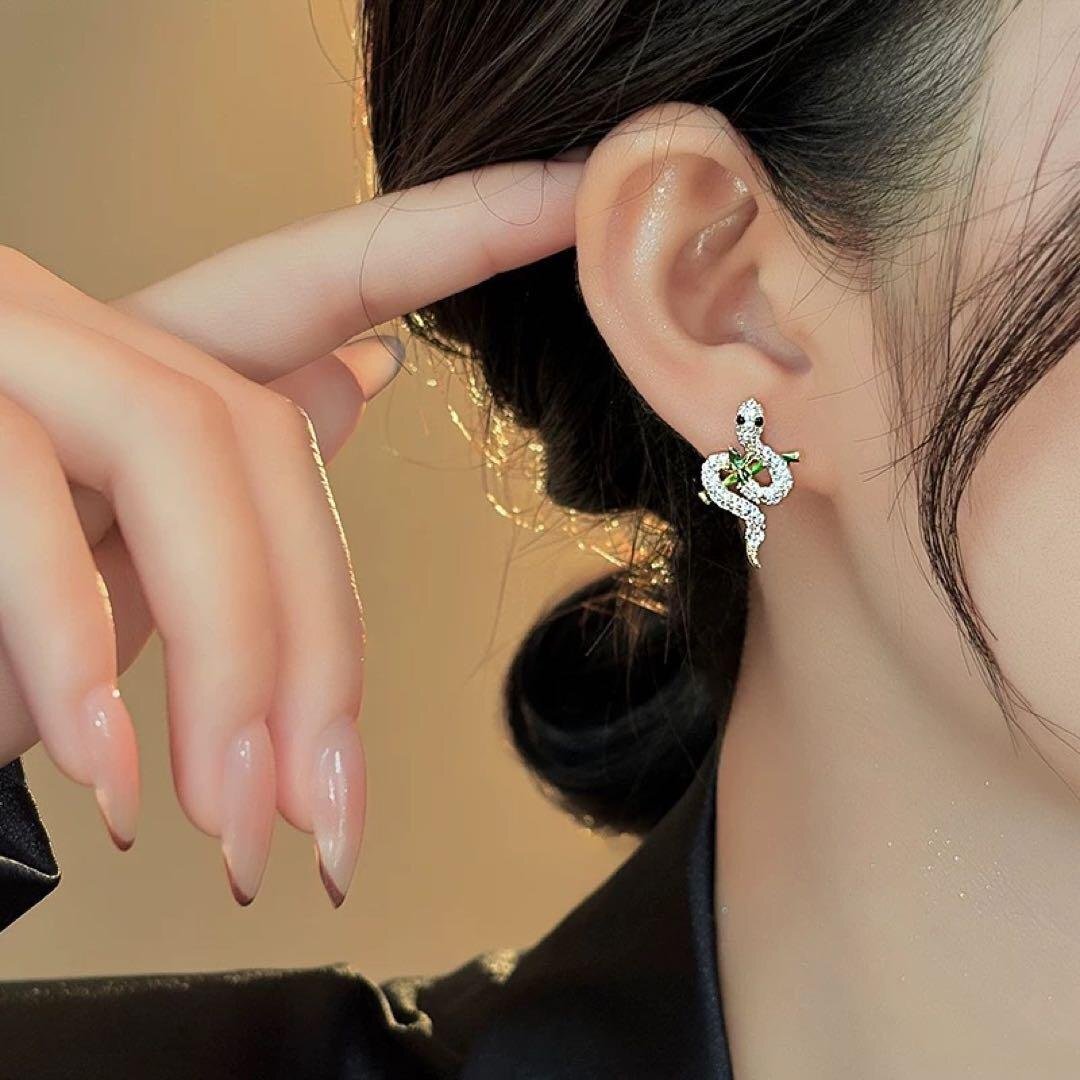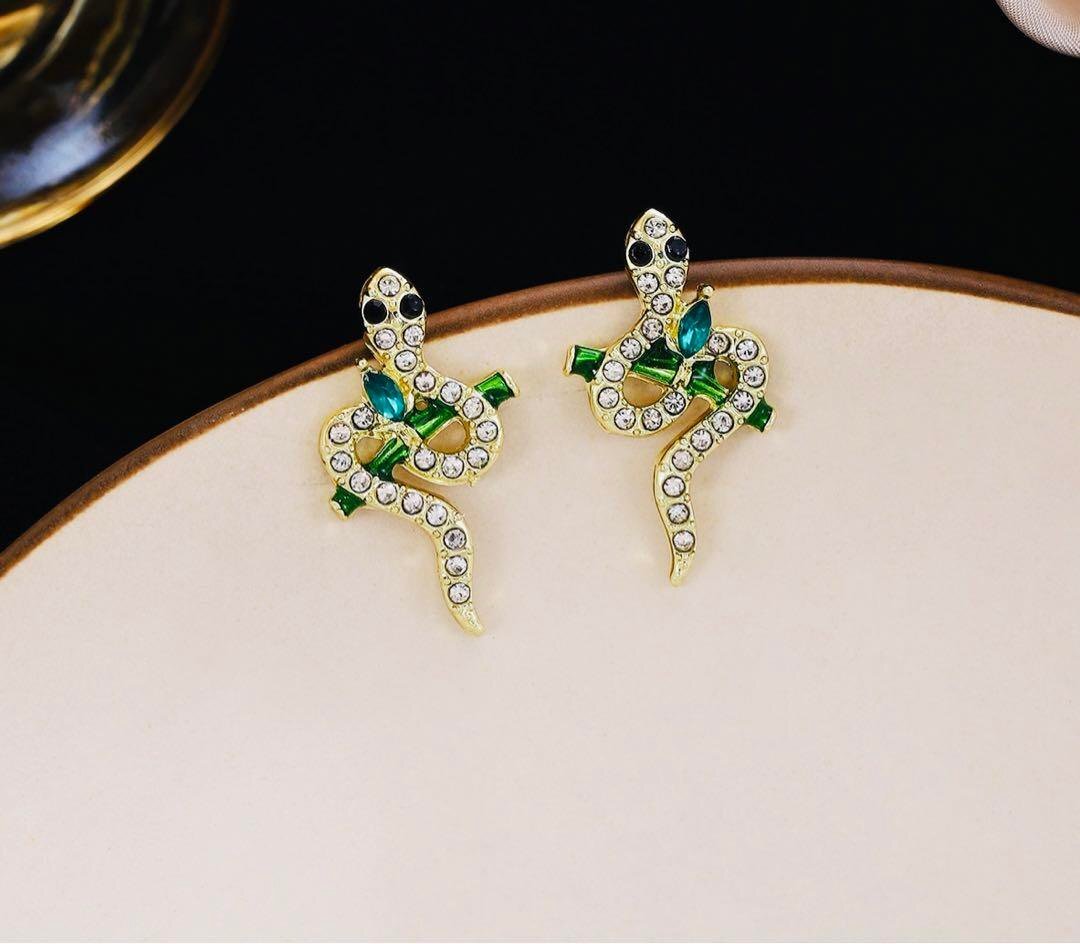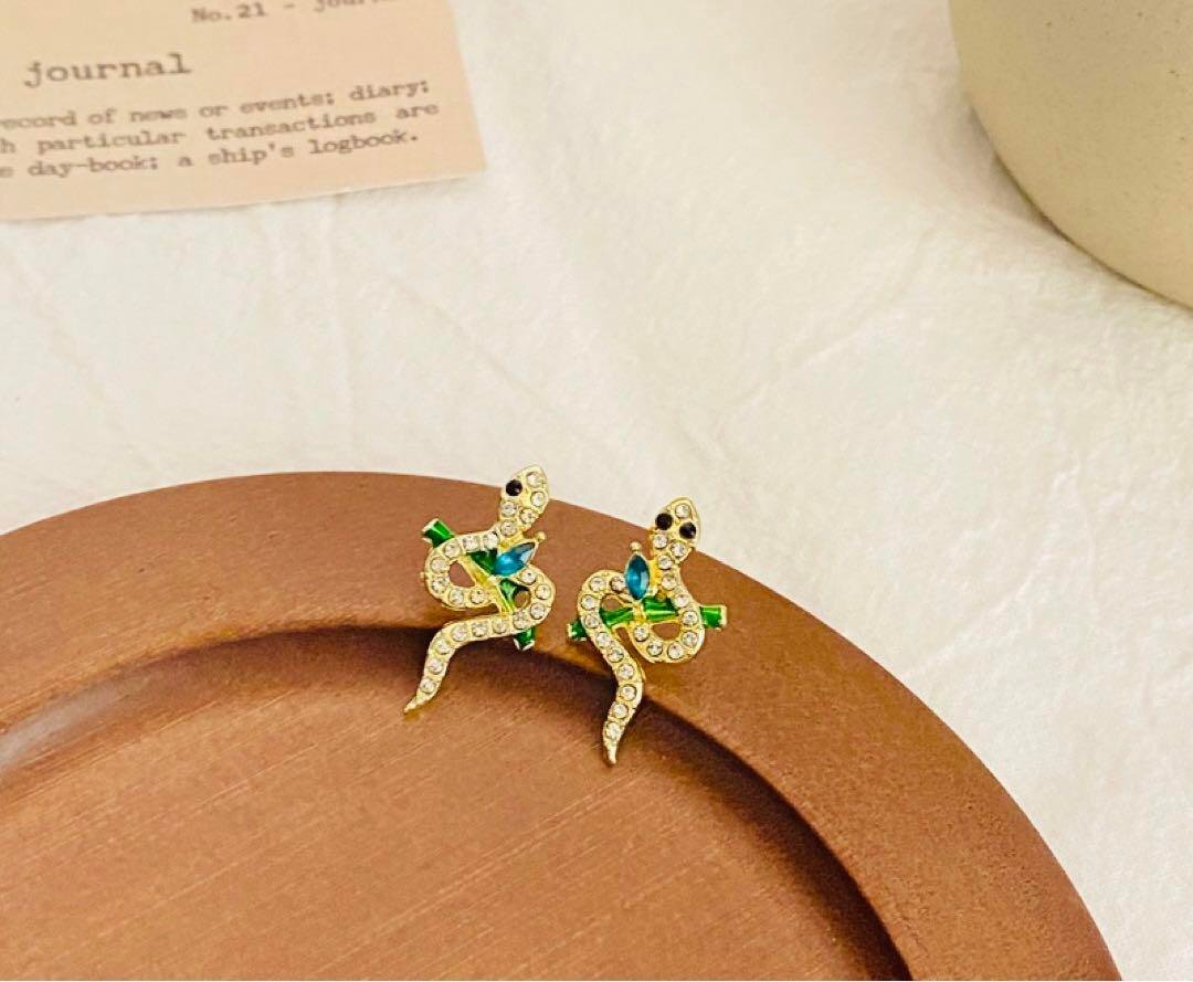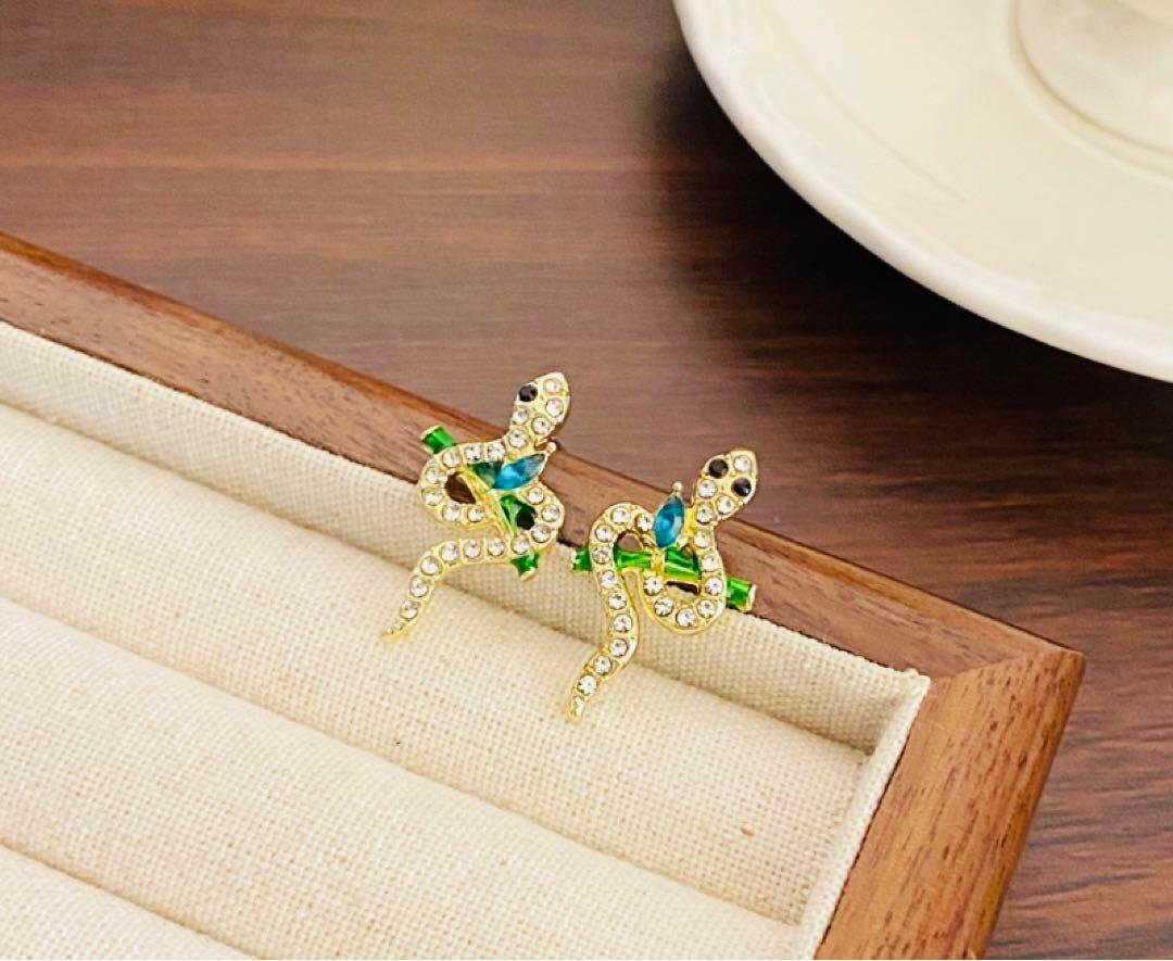 蛇のデザインにクリスタルとエメラルドグリーンのストーンが施された華やかなピアス。様々なファッションスタイルに合わせやすく、特別な日やカジュアルな日常使いにも最適です。