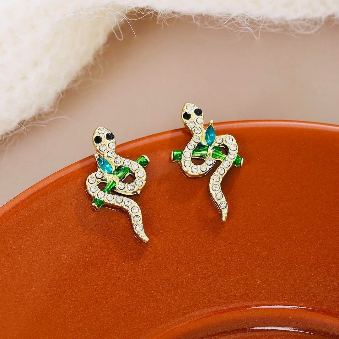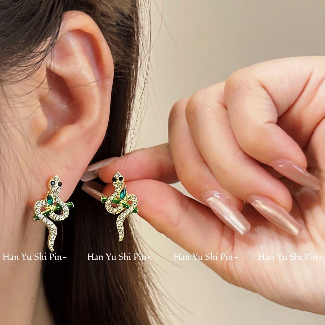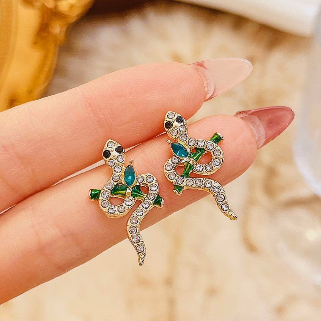 蛇のデザインにクリスタルとエメラルドグリーンのストーンが施された華やかなピアス。様々なファッションスタイルに合わせやすく、特別な日やカジュアルな日常使いにも最適です。