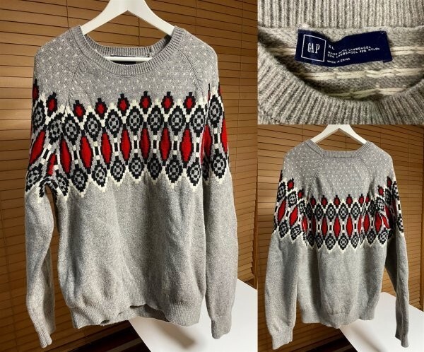 【激安1点のみ デザイン◎】GAP ギャップ 柄 ニット ラグランスリーブ ウール ナイロン系 長袖 セーター XL グレー USED