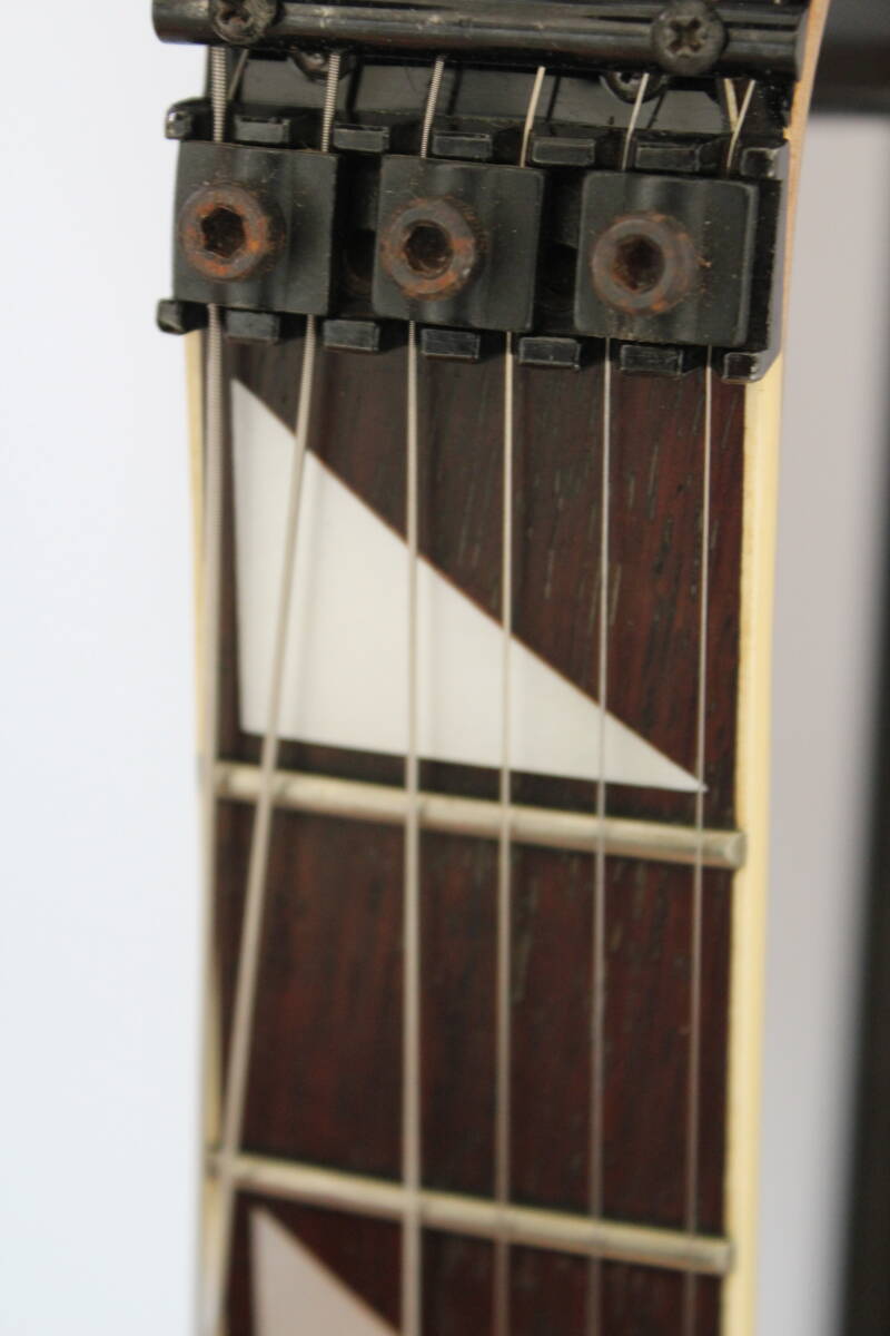 | PUはローインビーダンスFGITECHNOLOGYをそれぞれマウント。 トレモロシステムのHEAD CRASHER FRT-6Bを搭載している。 TEJ-85 1987~1989年製のジャパンビンテージです。 9Vの電池で駆動いたします。 https://www.fernandes.co.jp/fer_wp/wp-content/uploads/2012/09/1989_02.pdf ―商品説明― ブランド :FERNANDES 品番 :TEJ-85 定価 :93500円 ボディ :アルダー ネック :メイプル ネックジョイント :デチャッタブル(ボルトオン) 指板 :ローズウッド ナット幅 :42mm ピックアップ :FGI S H コントロール:1V.3 sw.miniSW h-icut/off/low-cut フレット数 :22F 重量:3.850kg ―商品状態― 状態 :B+ 特に問題なし ロッド残 :十分 フレット :8~9割以上残っています ネック :演奏上の問題はありません。 ボディ :角キズ、弾きキズがあり 電装系 :音出し確認済み。特に問題なし。 09-42エクストラライトが張ってあり、ネックはストレートです。 12Fの弦高は6弦2mm、1弦1.5mmで09-42で調整してあります。 セットアップ(クリーニング済、ロッド調整・オクターブ調整・弦高調整・PU高さ調整)済み、フレット山は演奏に問題ない高さがあり、トラスロッドは締める方向・緩める方向調整可能で±60°まで動作確認済みです。すぐに即戦力としてお使いいただけます。 | |||