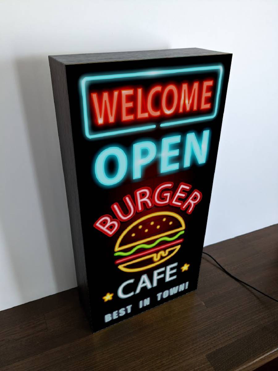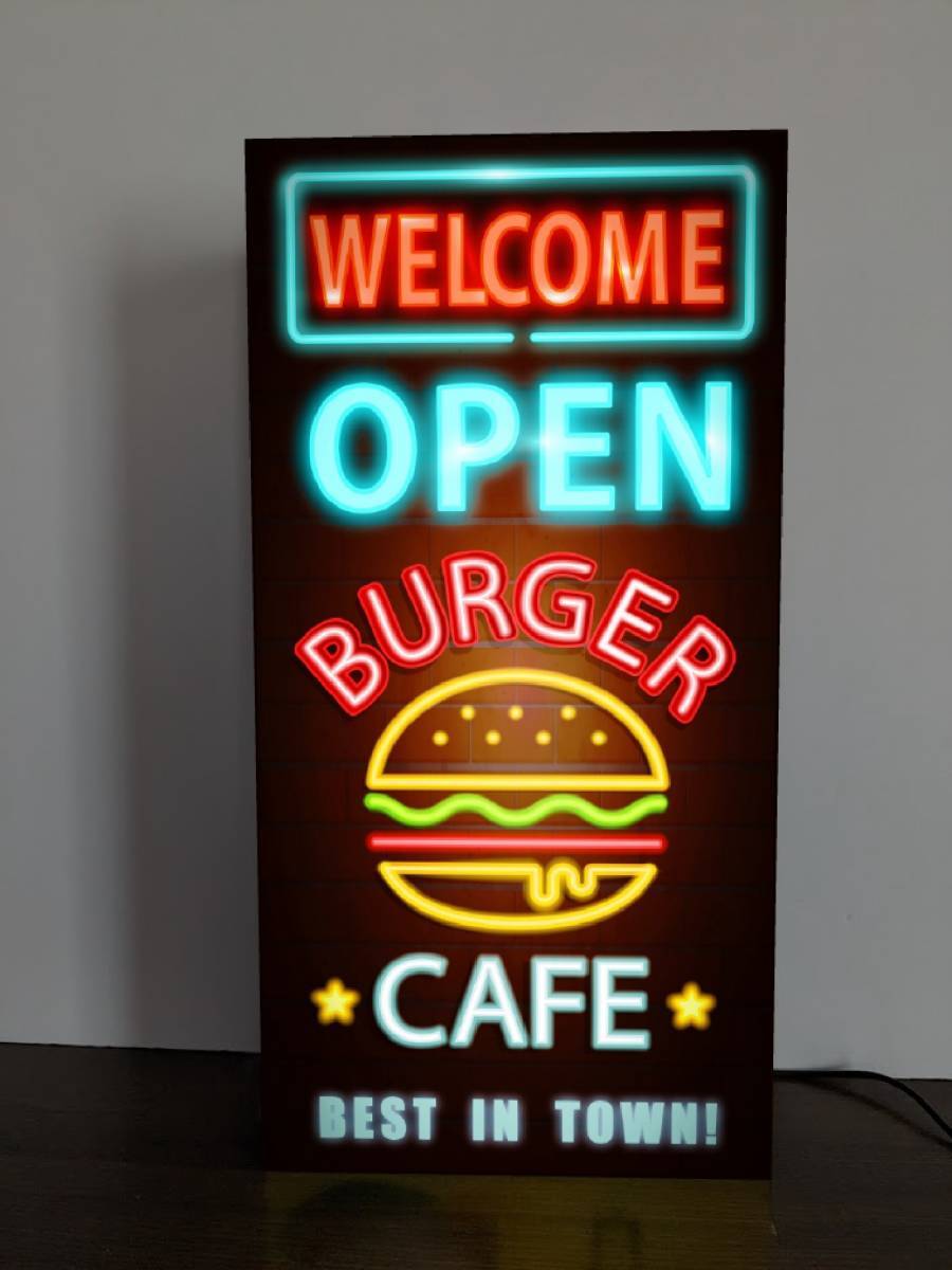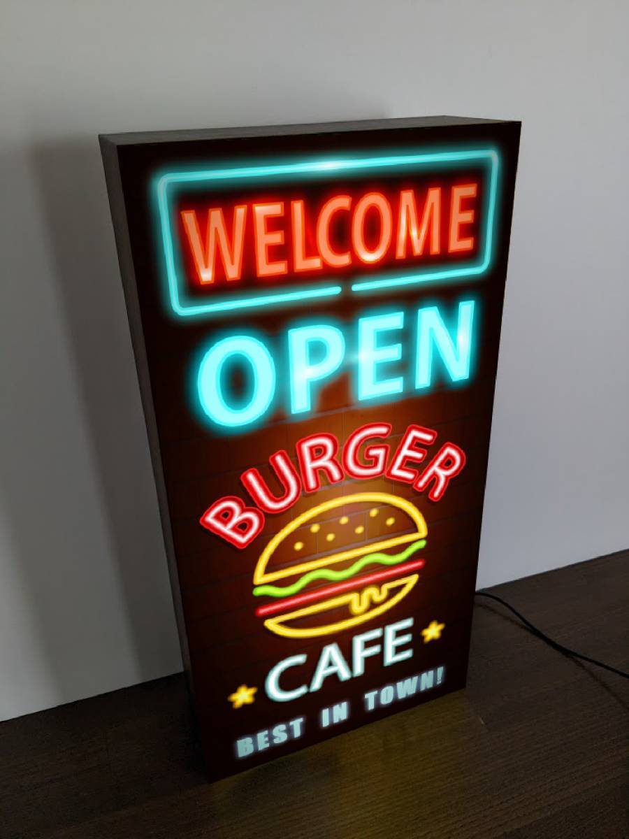 お店の窓際・カウンター・棚・テーブルやちょっとしたスペース、キッチンカー・屋台・イベント・パーティーなどに売り上げアップに 邪魔にならず丁度良い大きさの【ネオン系デザインのハンバーガー カフェ】LLサイズ電飾看板です★ ◆サイズ◆30センチ×60センチ×奥行き7センチ ◆材質◆本体(アクリルプラスチック製)・表示面(IJバックライト発光フィルム貼り) ◆電源◆100V供給電源(家庭用コンセント) 〇他サイズ〇 ●基本サイズ縦10センチ×横20センチ (3D造形BOX黒本体) ●Mサイズ縦150mm×横300mm ●Lサイズ縦200mm×横400mm ●3Lサイズ縦400mm×横800mm ●4Lサイズ縦500mm×横1000mm ◆オリジナルデザイン・オーダーも承っておりますので、お気軽にお問い合わせください。 自社製造製品 店舗 自宅 ガレージ 屋台 イベント パーティー LED サイン ランプ ライト 照明 看板 置物 雑貨 インテリア雑貨 テーブル カウンター 電飾看板 電光看板 光源の種類...LED