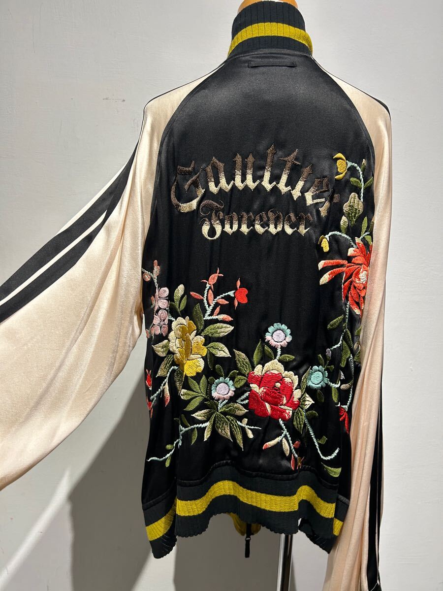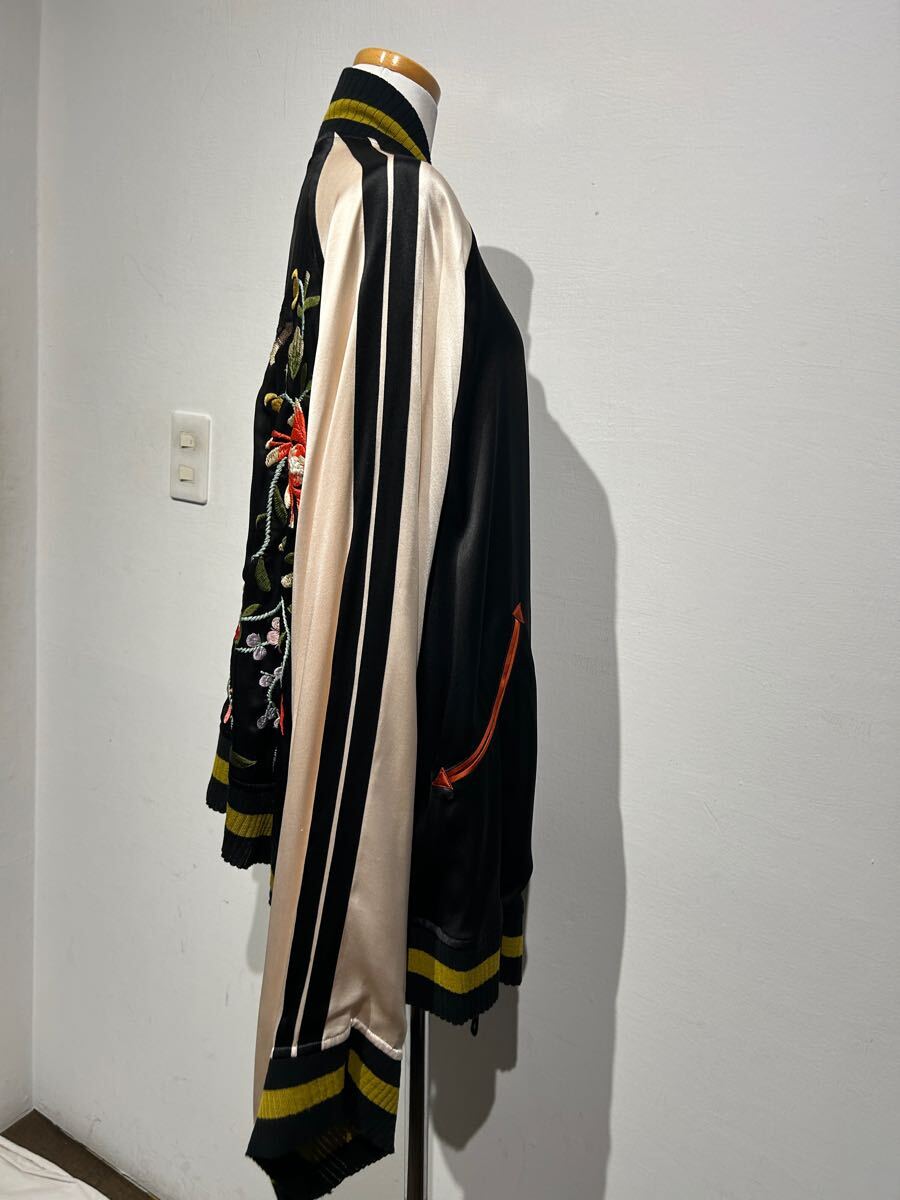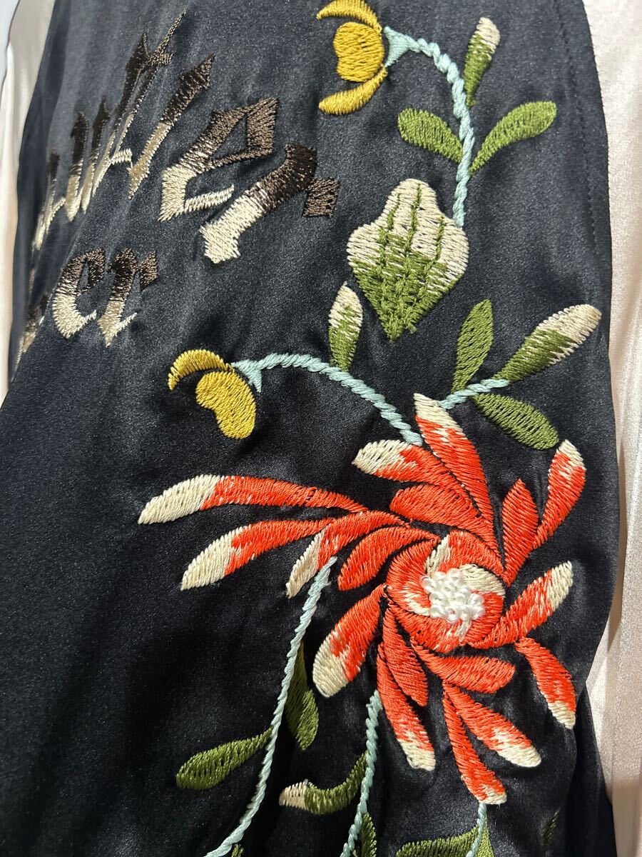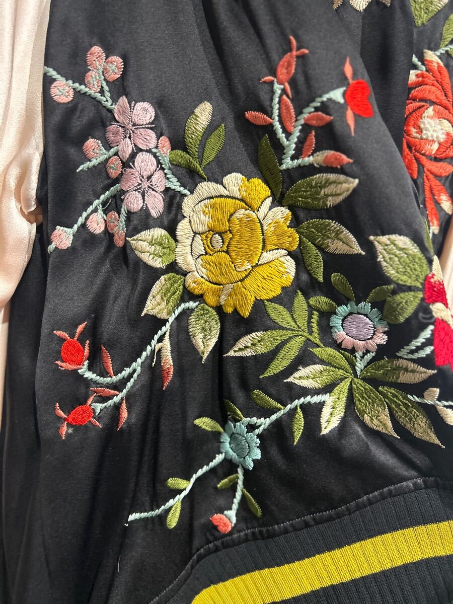 美しい刺繍が施されたシルク素材のジャケット。色鮮やかな花柄が特徴。