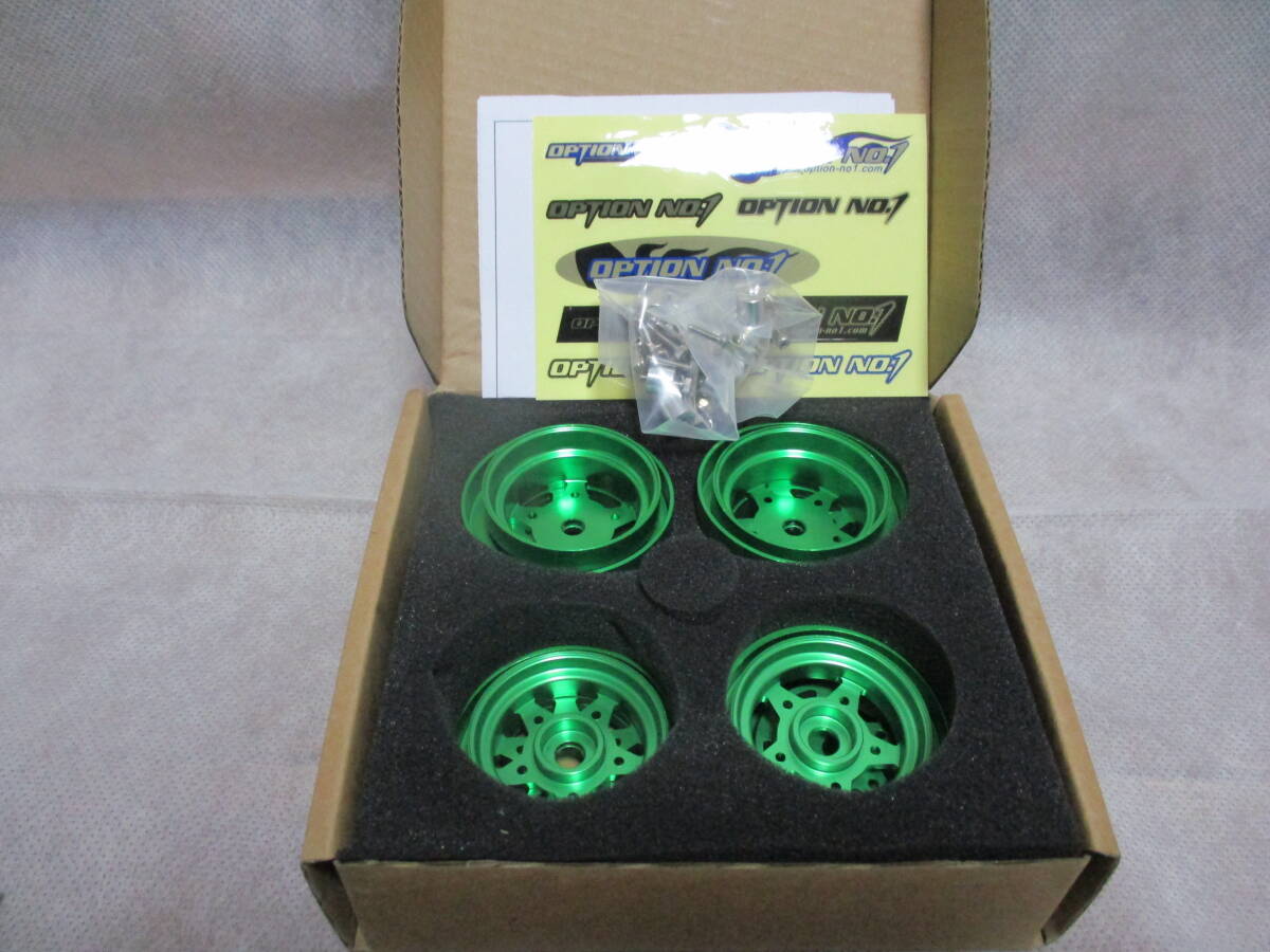 未使用品 OPTION No.1 グラスホッパー/ホーネット用アルミホイールセット (1台分/グリーン) ALS006、になります。